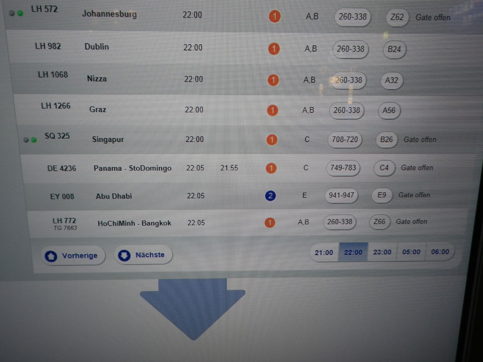In Frankfurt wurde wieder gewartet. Ich konnte nichts machen und regte mich so auch nicht auf. Ich hoffte auf ein normales einchecken – auch spät – wie am Samstag in Kiev. Dann sah ich jedoch bei der Infotafel, dass der Flieger für 21:55 statt 22:05 erwartet wäre. Was hatte das zu bedeuten – viel mehr Zeit, weil er da erst kommt?