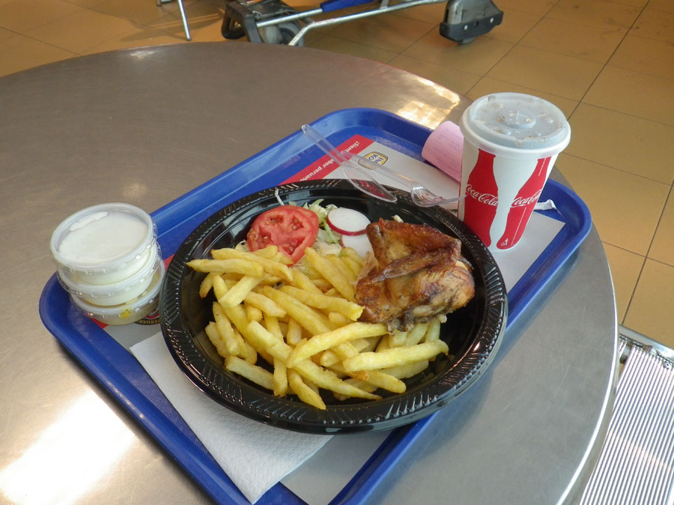 17:00 holte ich mir essen ab. Ich hatte schon ein gutes Menü zusammengeträumt aber das Essen hielt sich in Grenzen, war wohl auf 20 PEN beschränkt. War auch OK, dann durch die Passkontrolle und den Rest – alles easy.
