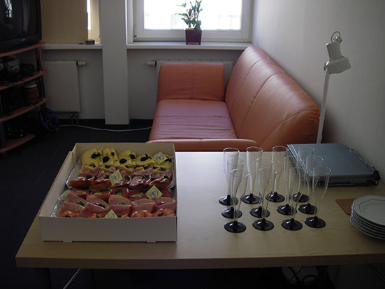 Einen Tag vor Abreise lud ich die liebe Verwandschaft mal zur Bürobesichtigung. Wir trafen uns zum Café und stießen mit viel Sekt auf die Zukunft an. Vorher hatte ich die Visitenkarten geholt. Bin sehr zufrieden damit.