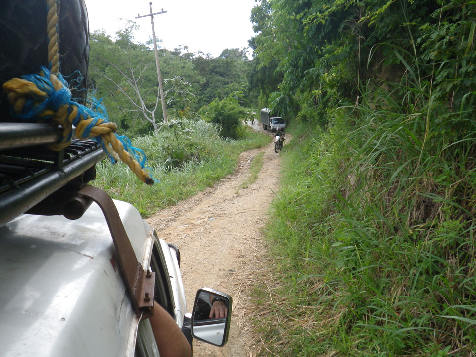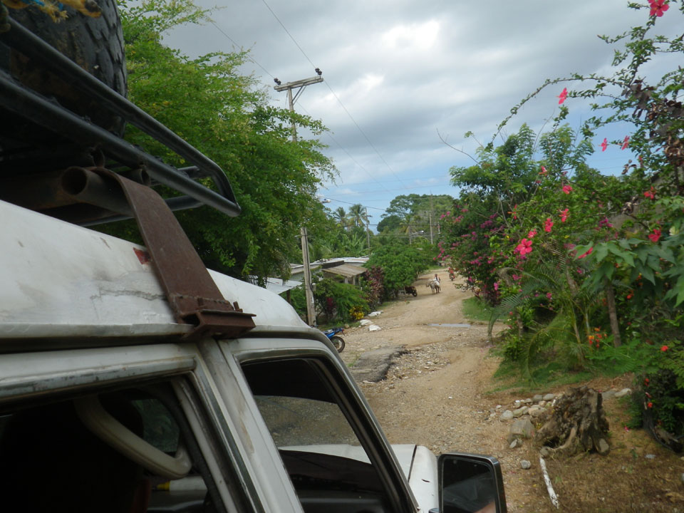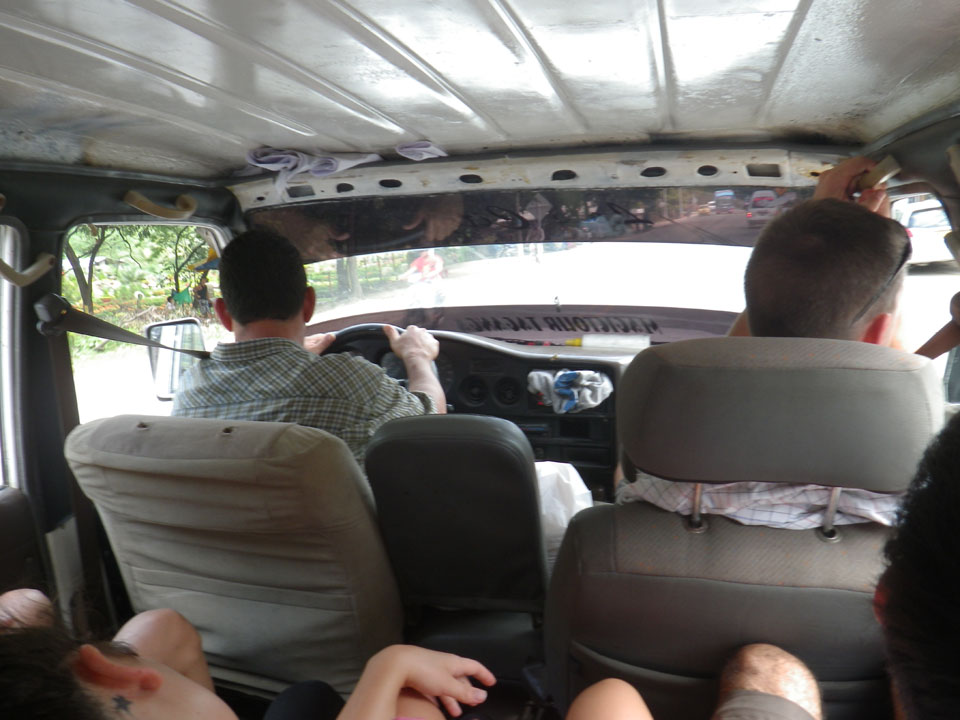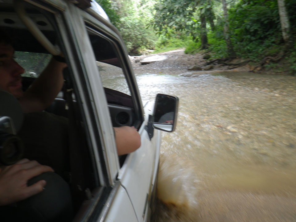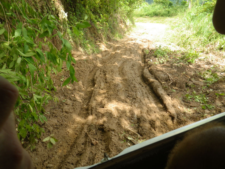 Das Auto wurde voll. Hinten zu viert auf engem Raum in der Hitze. Hinter mir ein Fester, das war gut. Die Musik aus der Box am Bein, die ich mit ’ner Wasserflasche vom meinem Schenkel abfedern konnte. Die Fahrt war wenig bequem und dann ging’s auch noch auf eine Schlammpiste.
