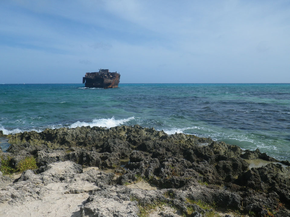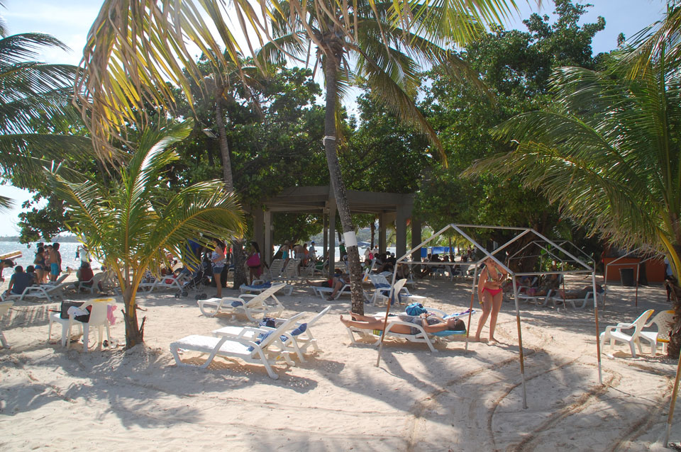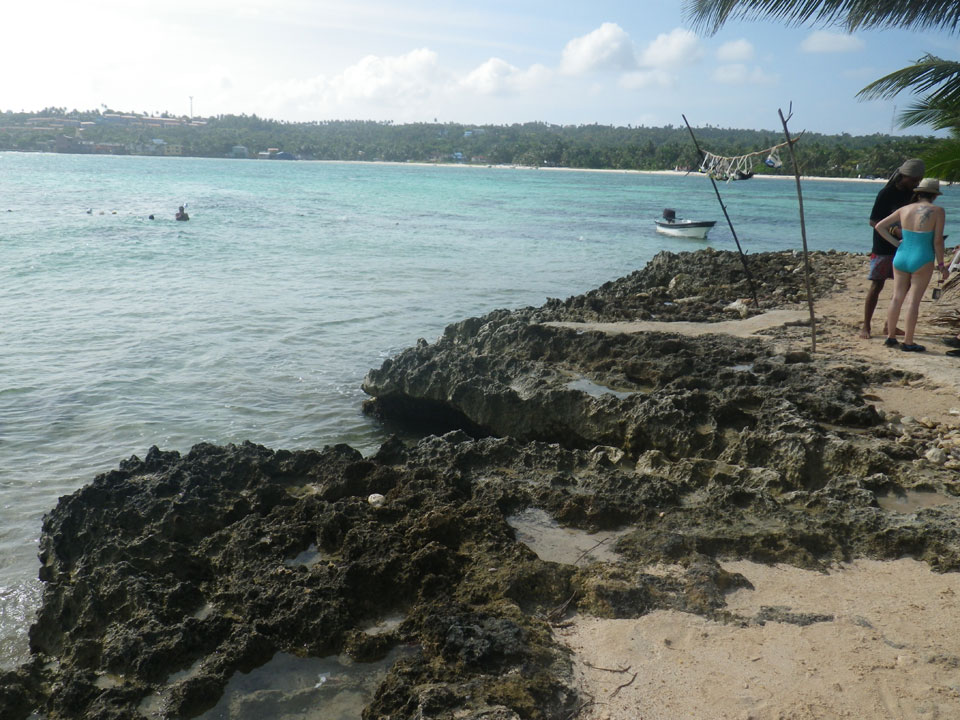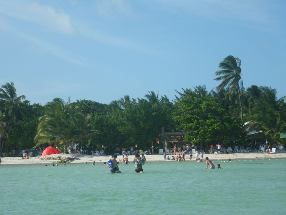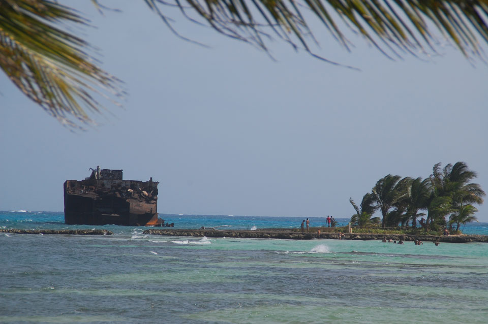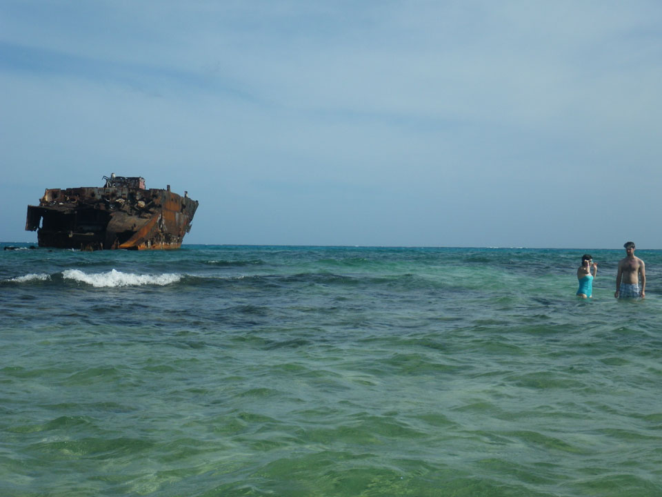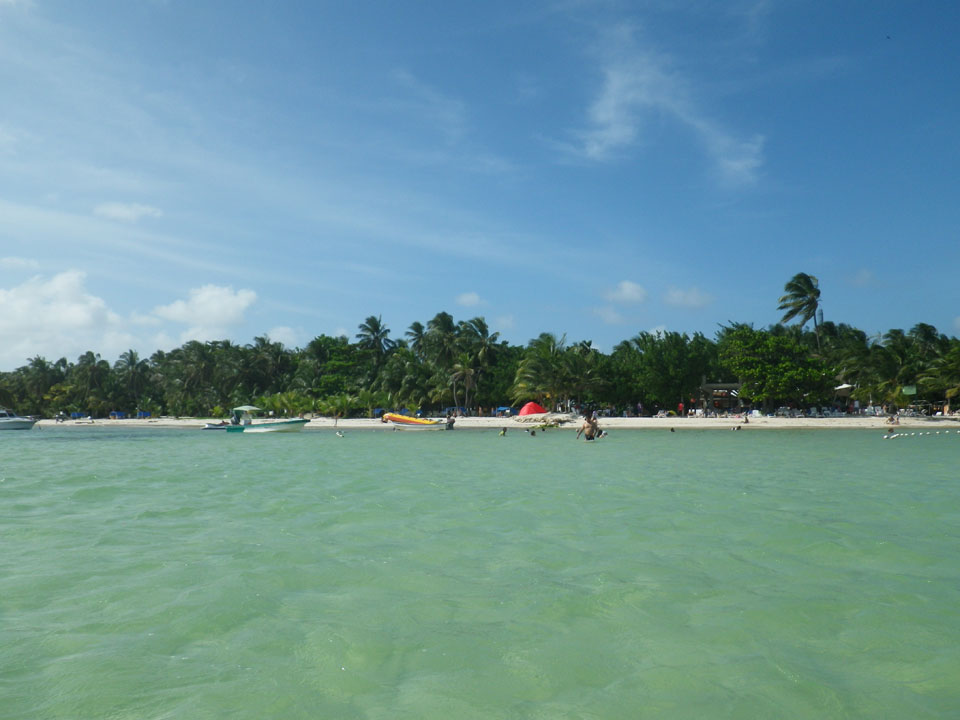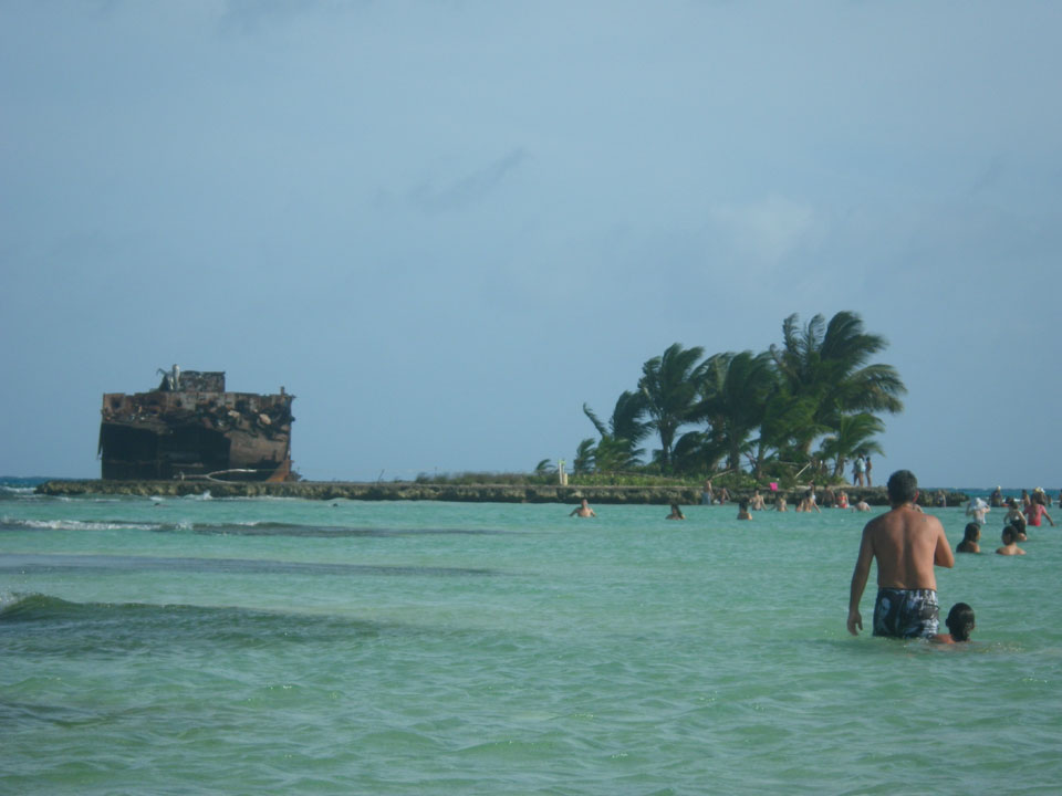 Dort war ein Resort oder Hotel, jedenfalls viele Leute. Ich sah das Schiffswrack. Zunächst hatte ich Rocky Cay auf der anderen Inselseite vermutet, jetzt also hier. Ich holte mir einen Locker (COP 5.000) und ’ne Limo bei der Hitze. So stiefelte ich durch’s Wasser auf die Insel. Bei den Vulkansteinen wären meine neuen Schwimmschuhe von gestern heute richtig gewesen. Die Flipflops reichten gerade so.