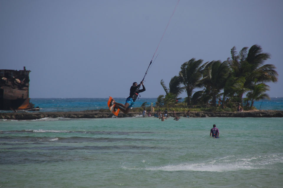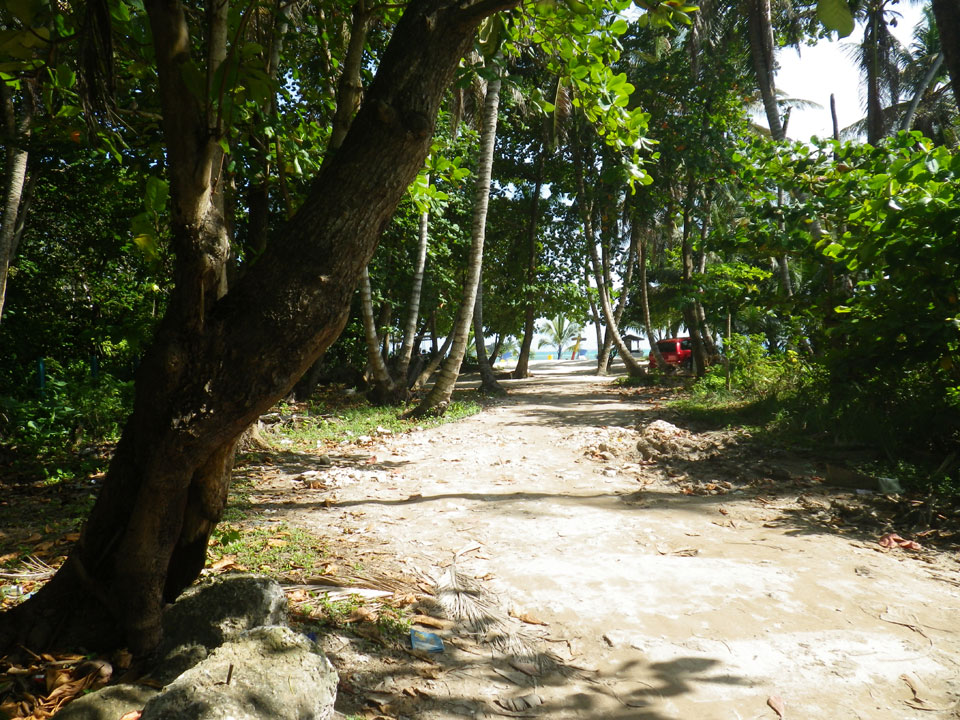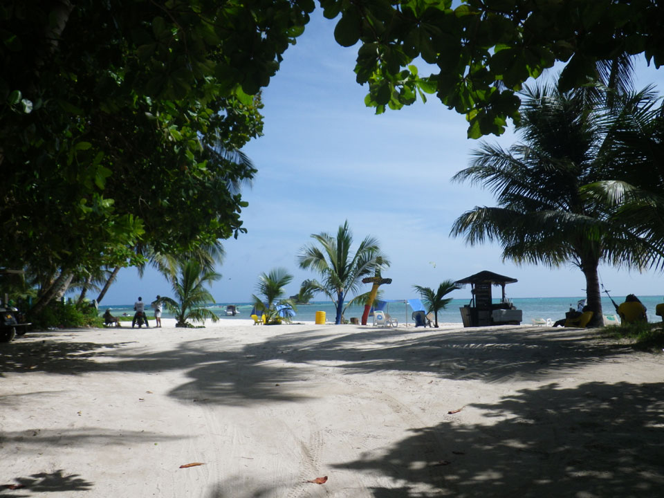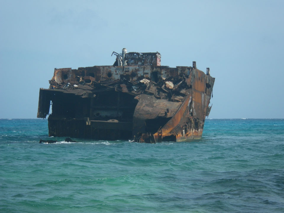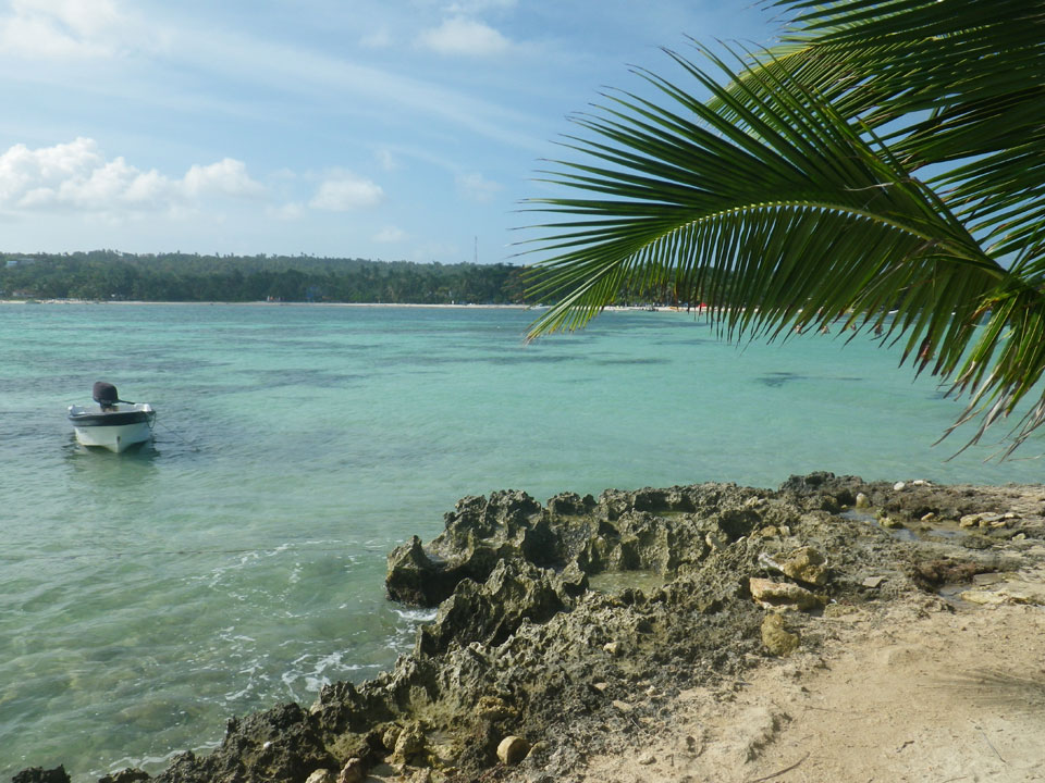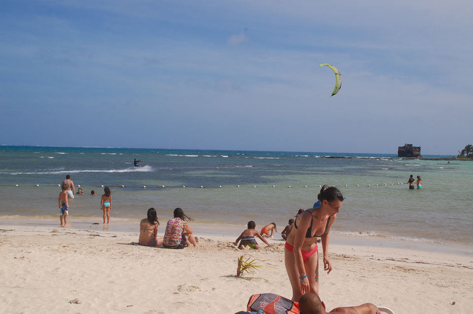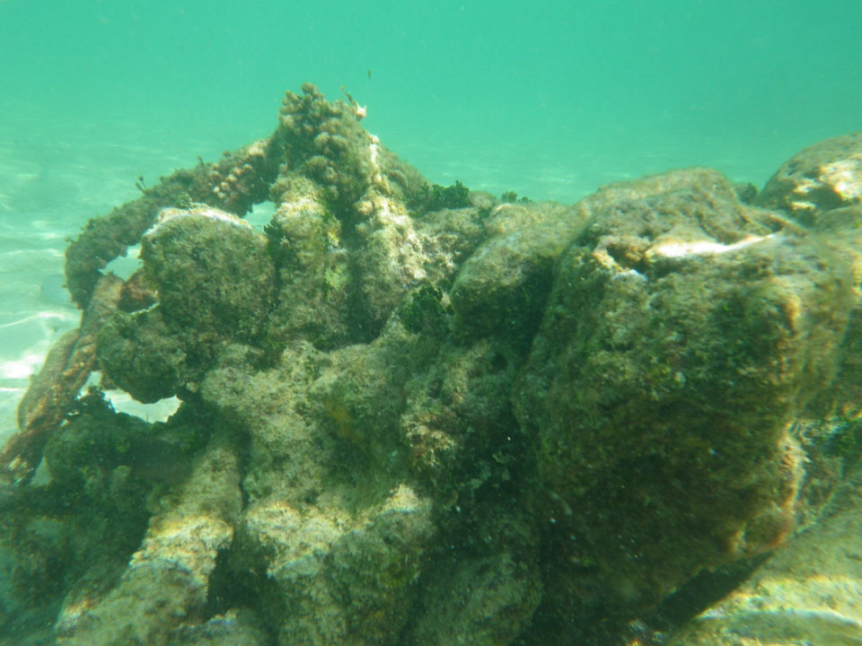 Dort war ein Resort oder Hotel, jedenfalls viele Leute. Ich sah das Schiffswrack. Zunächst hatte ich Rocky Cay auf der anderen Inselseite vermutet, jetzt also hier. Ich holte mir einen Locker (COP 5.000) und ’ne Limo bei der Hitze. So stiefelte ich durch’s Wasser auf die Insel. Bei den Vulkansteinen wären meine neuen Schwimmschuhe von gestern heute richtig gewesen. Die Flipflops reichten gerade so.