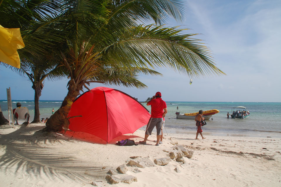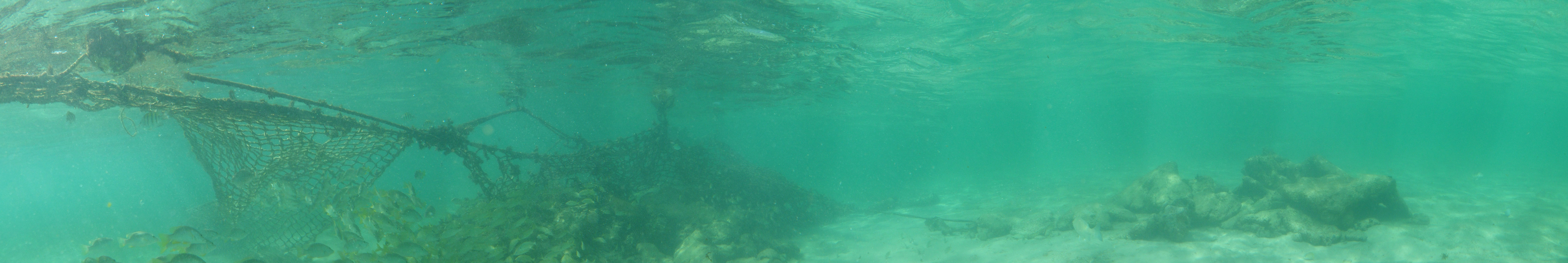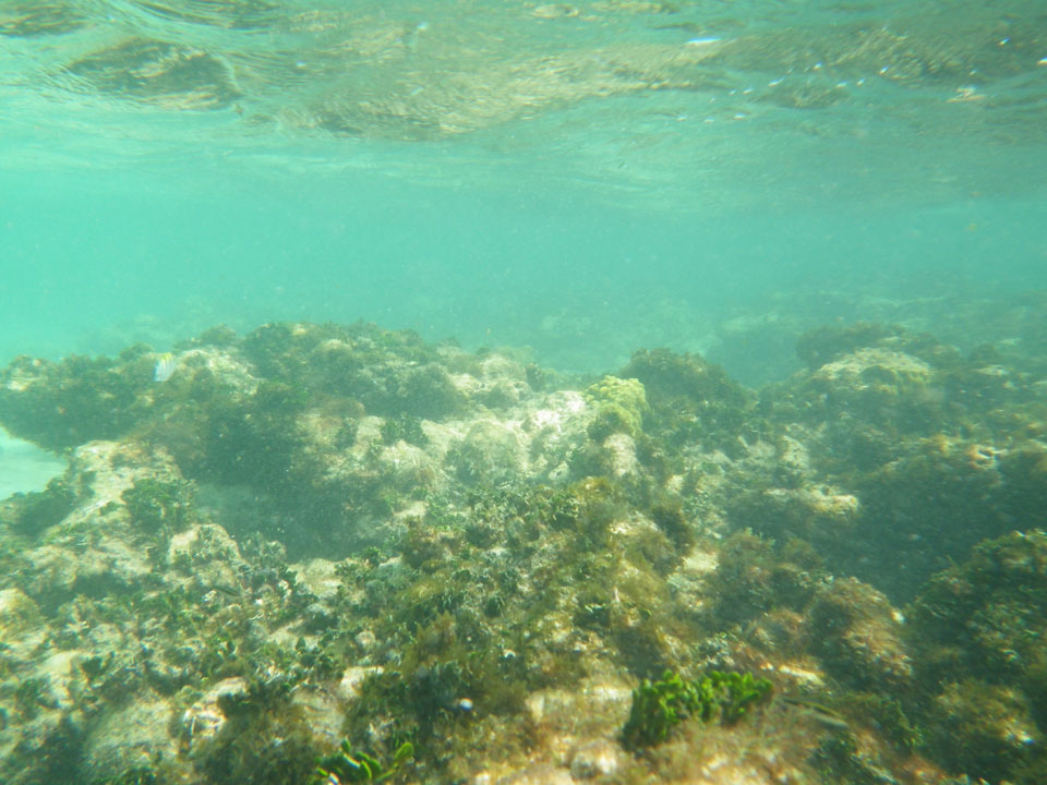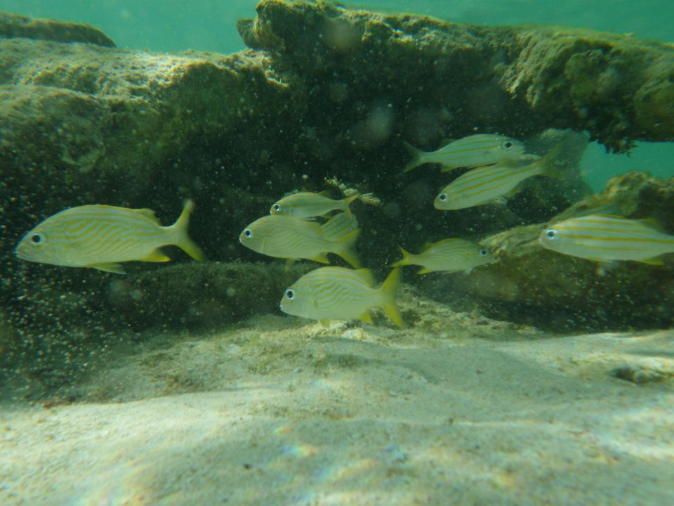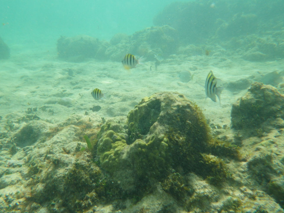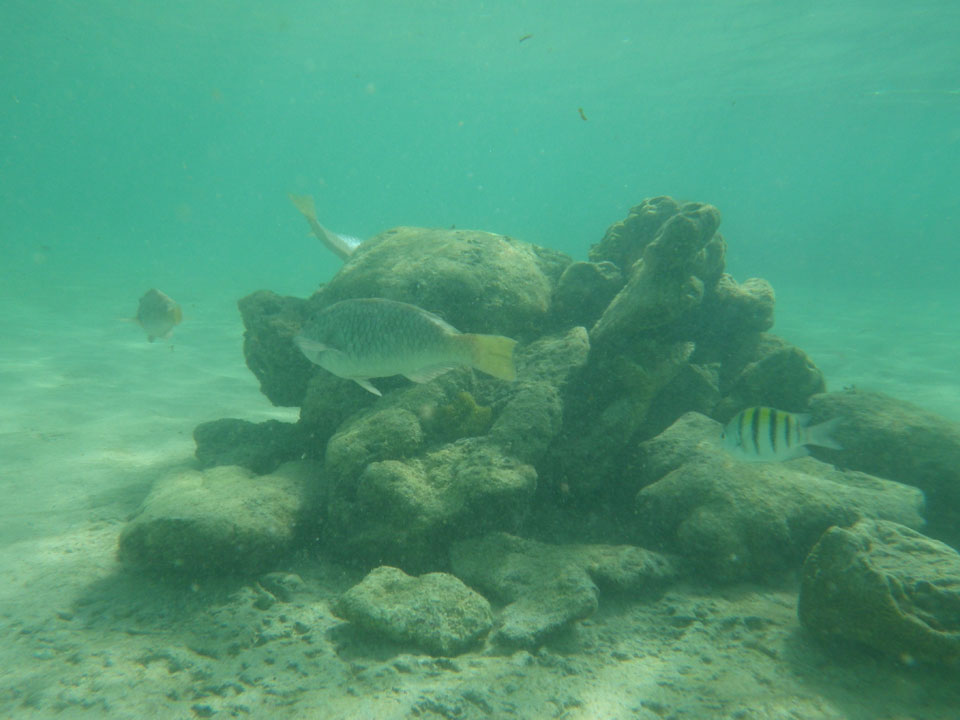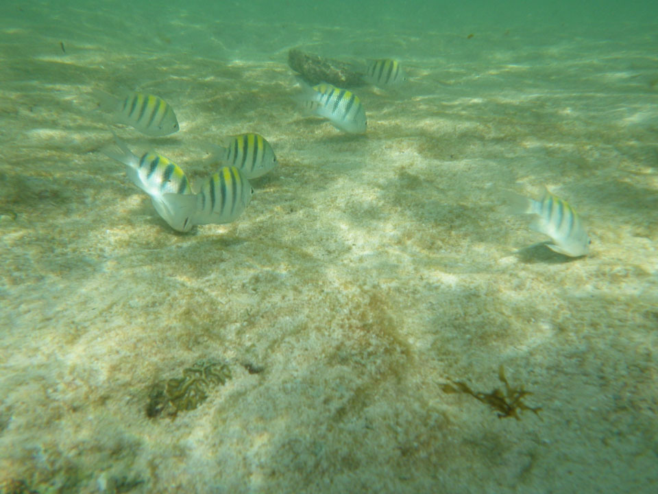 Im Wasser war’s dann wieder super. Taucherbrillen konnte man sich auf der Rocky Cay leihen, ich hatte meine eigene dabei. An einem Netz versteckte sich ein netter kleiner Schwarm von Fischen. Ansonsten schwammen hier auch einige herum. Ein netter kleiner Ort, gut für viele Photos.