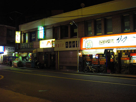 Schon finster versuchte ich mir ein paar Wegepunkte zu merken, damit ich wieder zurückfand. Mit dem PDA bewaffnet schienen ein paar WLANs offen. In irgendeinem Straßenrestaurant zeigte ich auf was für W2,000, das sorgte für Verwunderung, dann zeigte ich auf was für W4,000 – OK. Es wurden Schrimps mit Reis, Algen? und Sesam gebraten. Dazu wieder das allgegenwärtige Kimchi (eingelegter scharfer Kohl) und ein anderer Salat. Super lecker, wenn auch etwas zu mild. Das wird noch lustig, wenn ich öfters was esse. Sollte mir die Zeichen merken, damit ich nichts doppelt bestelle.