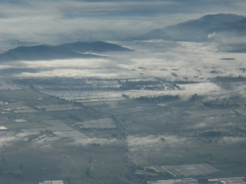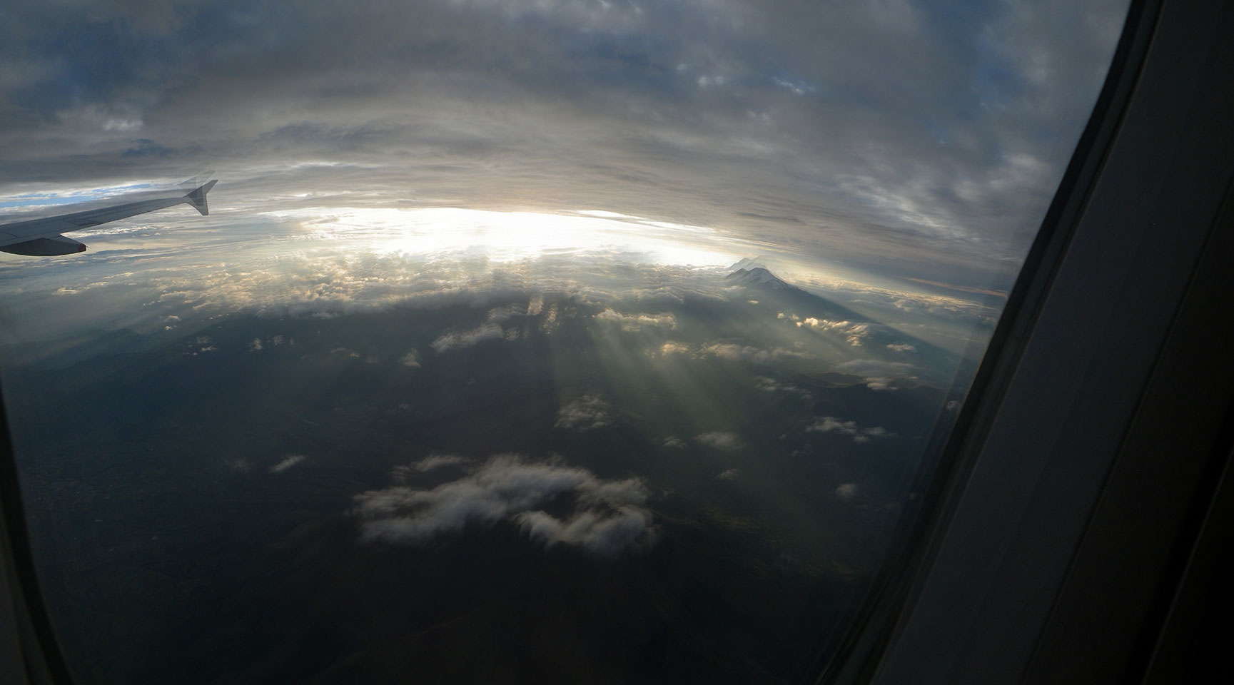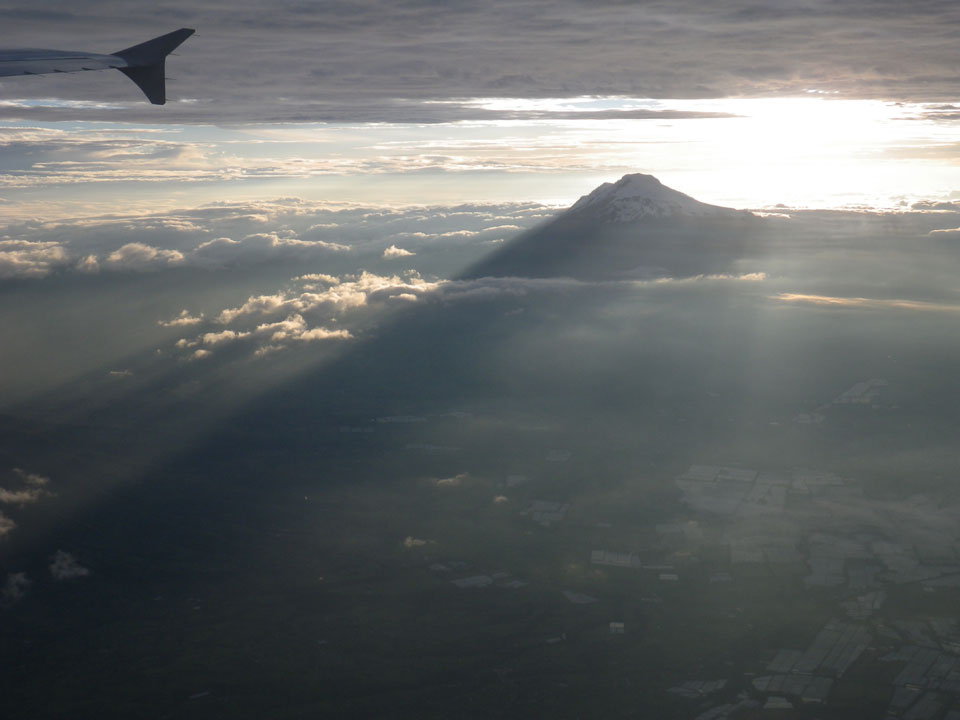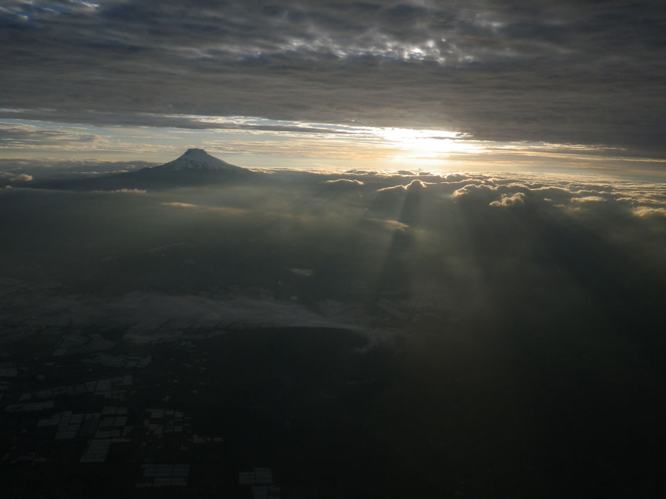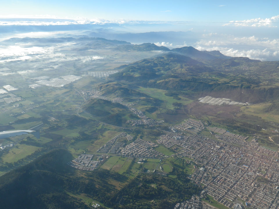 Der Flug startete phänomenal: Cotopaxi(?) sah ich aus dem Fenster und mit dem Sonnenaufgang war das Licht einfach genial. Die Wolken, die Aussicht und alles fand ich super. Auch bei der Landung in Bogota sah das mit dem Morgennebel einfach Klasse aus.
