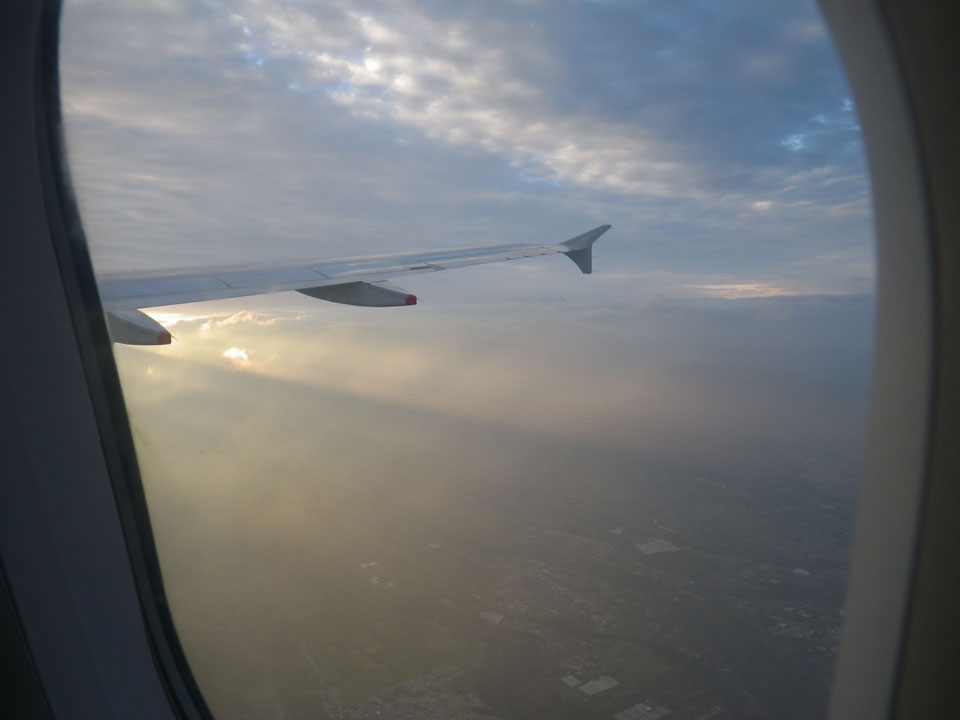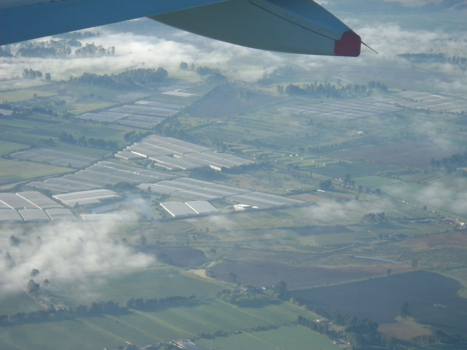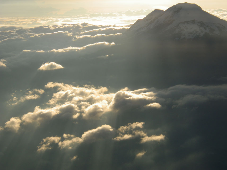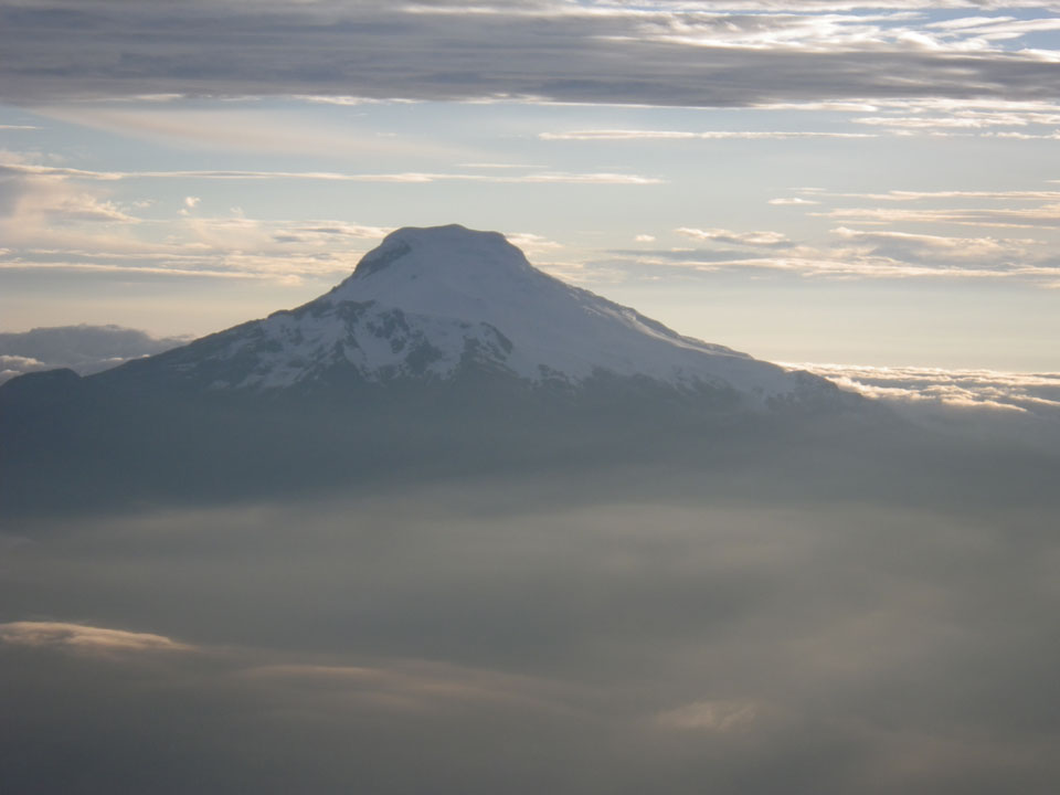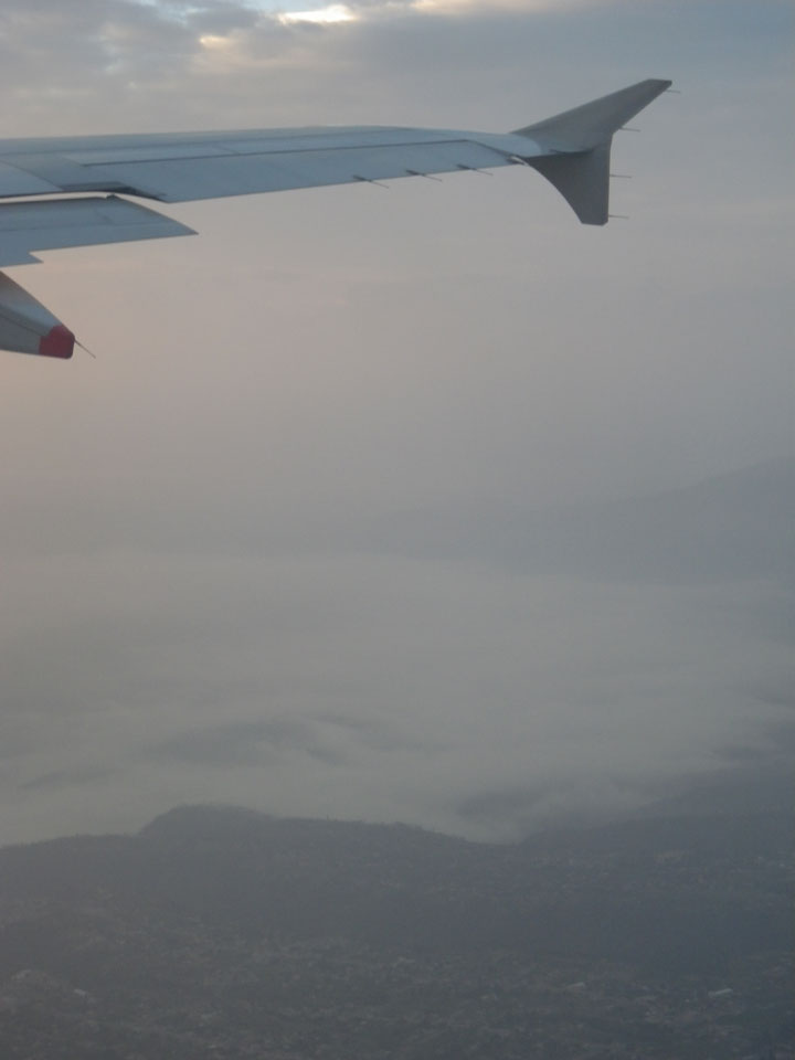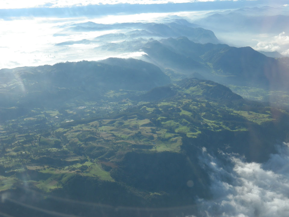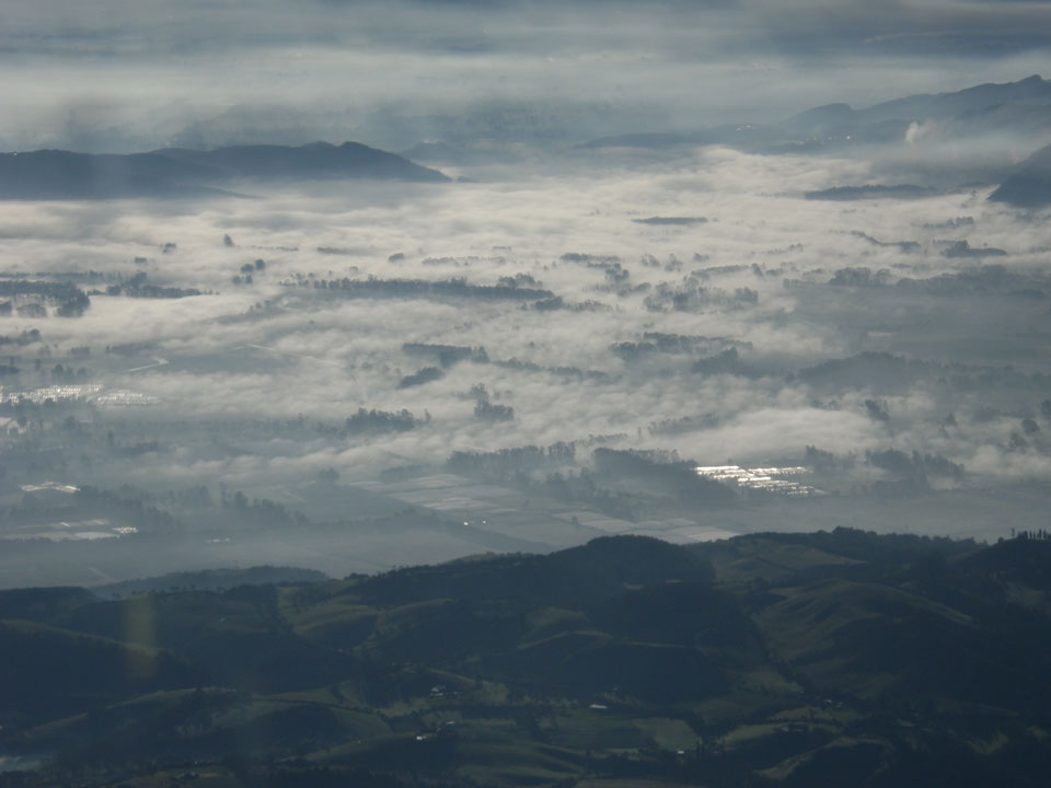 Der Flug startete phänomenal: Cotopaxi(?) sah ich aus dem Fenster und mit dem Sonnenaufgang war das Licht einfach genial. Die Wolken, die Aussicht und alles fand ich super. Auch bei der Landung in Bogota sah das mit dem Morgennebel einfach Klasse aus.