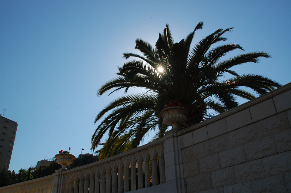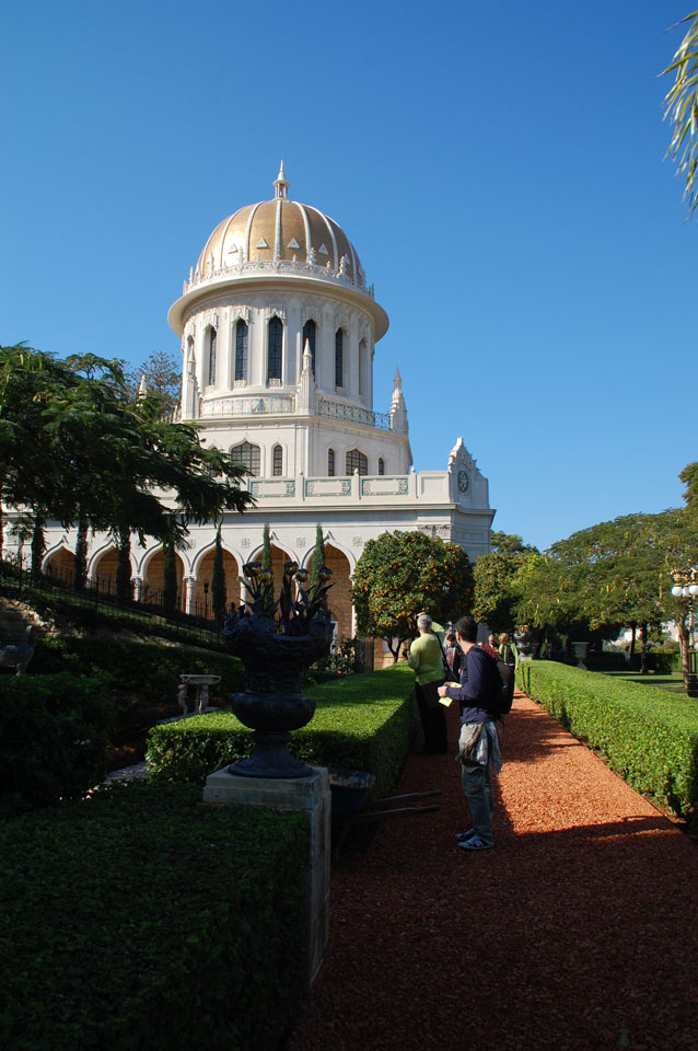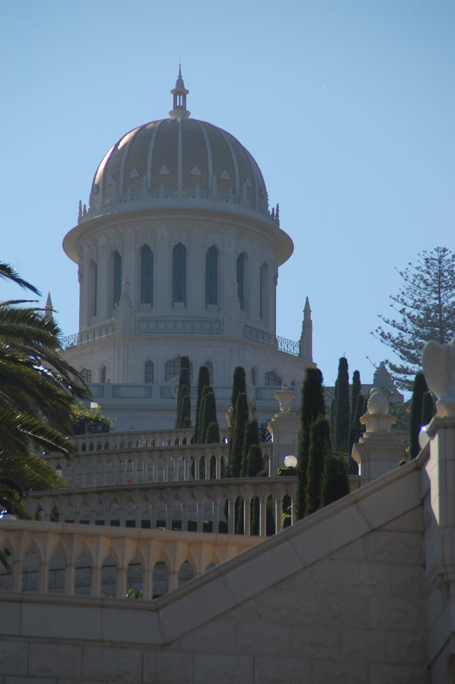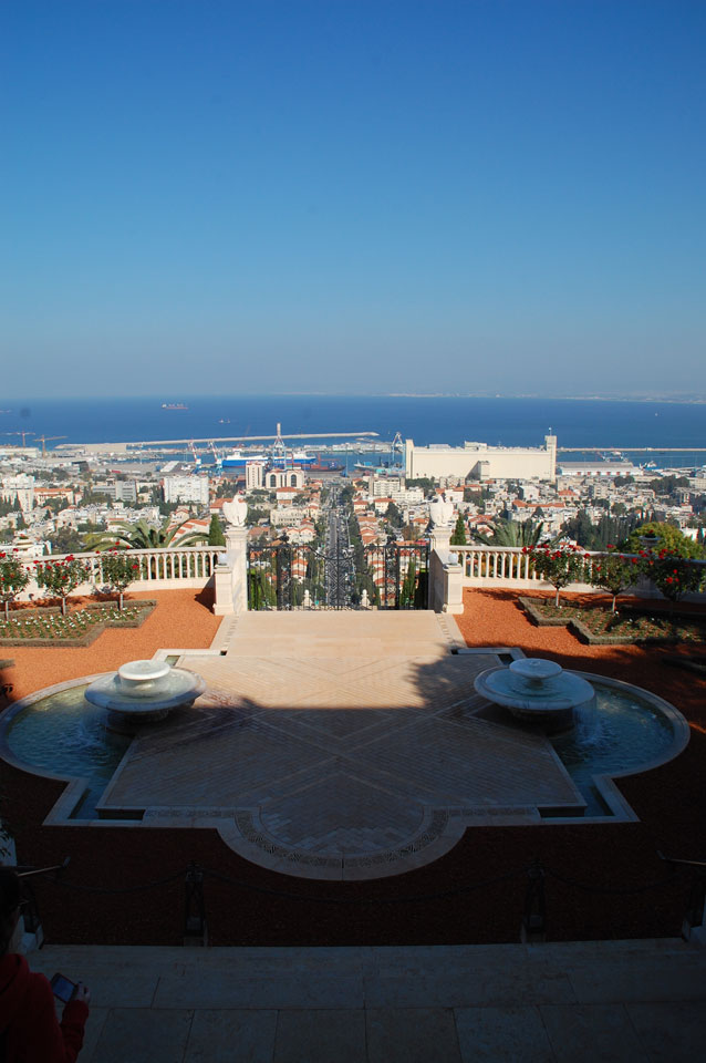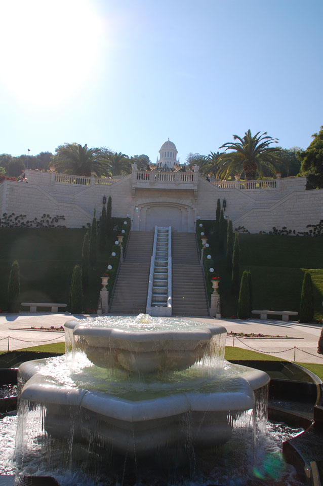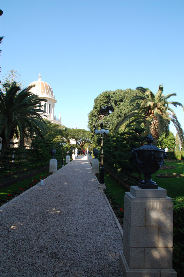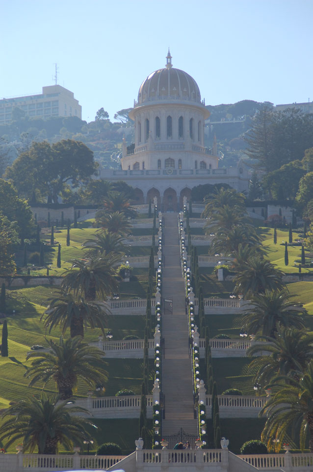 Die Bahá’í Gärten waren sicher eine der saubersten Gärten, die ich jemals sah. Blank geputzte Wege, herrliches Wetter. Ich sah den Schrein, in dem keine Photos erlaubt waren. Ein paar Blumen und Kerzen, was mir nicht viel sagte. Ich habe mit der Religion eben nichts am Hut.