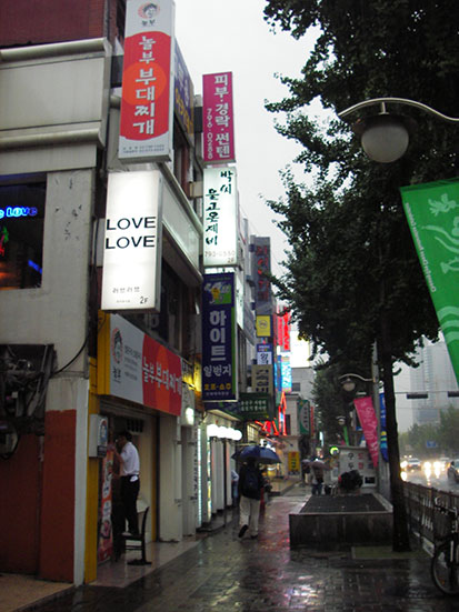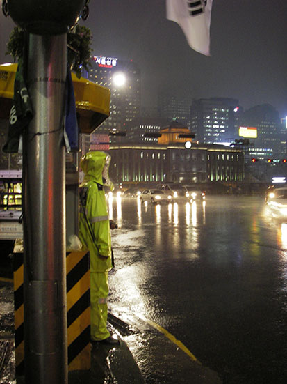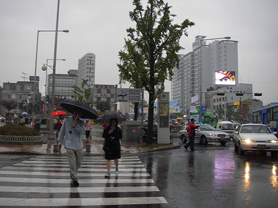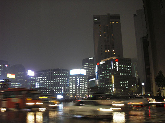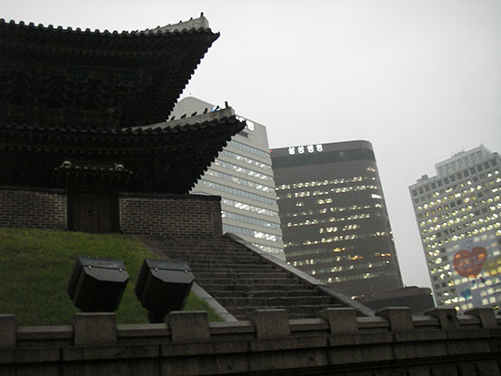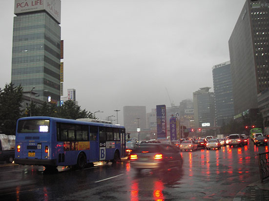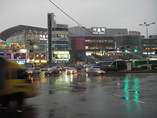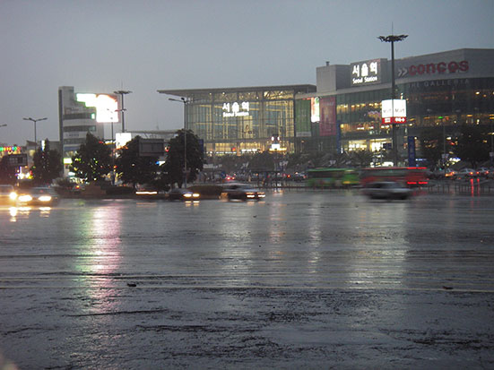 Danach ging ich zur Seoul Station. Nichts besonderes dort, ich versuchte noch trocken zu bleiben – erfolglos. Die Schuhe waren durch. Meine Jeans, erst gestern gewaschen, bekamen nochmal eine Spülung. Bissel weiter schlug ich mich noch durch. Bis zur City Hall. Dann hatte ich keine Lust mehr. Bei schönem Wetter kann man Seoul auch gut zu Fuß erkunden aber heute regnete es den ganzen Tag durch. Nach Wetterbereicht auch noch die Nacht und teilweise morgen.