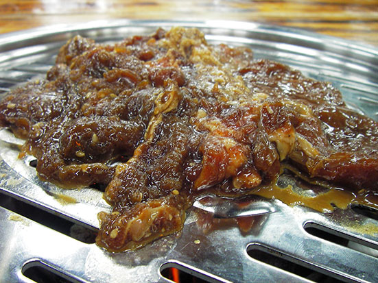 In den Tisch wurden heisse glühende Steine gelegt, darauf kam eine Platte mit Fleisch. Ich schaute mich erst mal um, wie die Locals das Essen. Man nimmt ein Salatblatt, belegt es mit allem, was man will und wickelt es dann bissel zusammen, damit es in den Mund passt. Ich wollte es doch einzeln esse aber die Kellnerin zeigte es mir nochmal. War alles sehr gut und wieder mal was anderes. Mit Coke kam das insgesamt W8000. Auch günstgig, für den Aufwand.