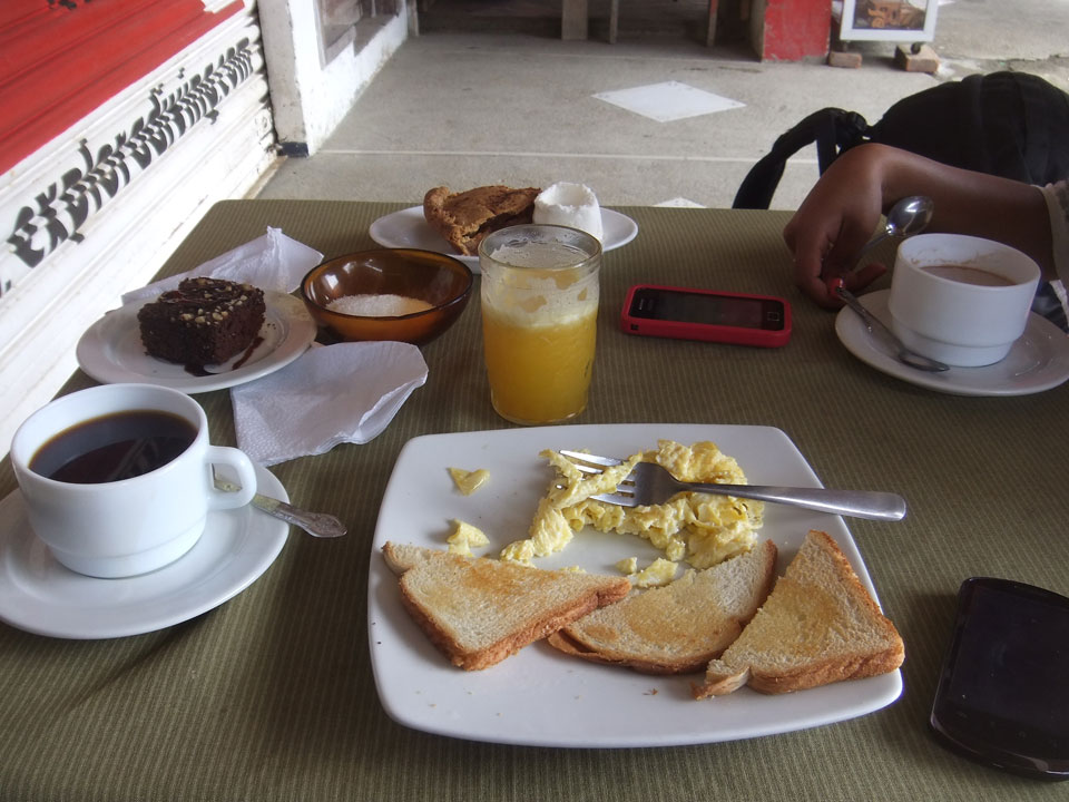 Wir wollten nach Montañita aber zuerst musste ein Frühstück her. Das gab’s mit hausgemachten Kuchen und Brownie – alles ganz gut wieder. Der Bus kam dann auch nach ein paar Minuten Wartezeit und fuhr ca. 1 1/2h dann Richtung Süden.