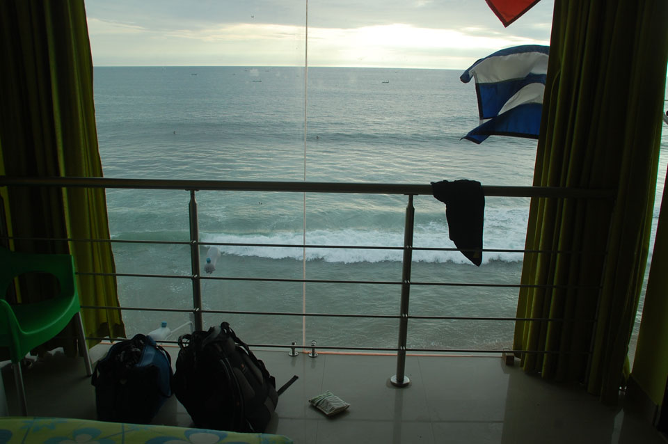 Da waren wir also: Montañita, ein Backpacker-Mekka in Ecuador. Zuerst brauchte ich noch eine kleine Stärkung gleich der Bäckerei neben der Bushaltestelle. Ein Taxi sollte uns erst mal in’s Balsa House fahren. Das Surf Camp wurde empfohlen, war jedoch ein ganzen Stück von der Action entfernt. Ich schaute mir ein Zimmer an. Das war schon schön mit Balkon, Hängematte und voll im Grünen. Für $80 jedoch etwas happig und so ging’s zurück in den Ort. Das vom Taxifahrer empfohlene Piano Piano Hostal hatte auch Zimmer, jedoch ohne Fenster und nur mit A/C wollte ich nicht schlafen. Das war fast wie Gefängnis und mit $40/Nacht vollkommen zu teuer.