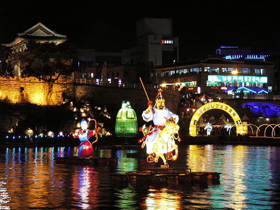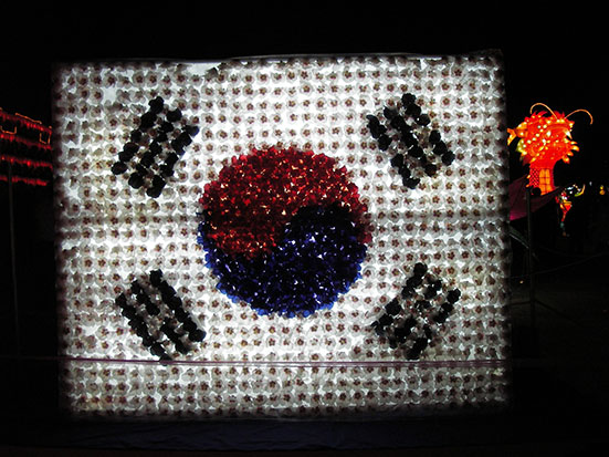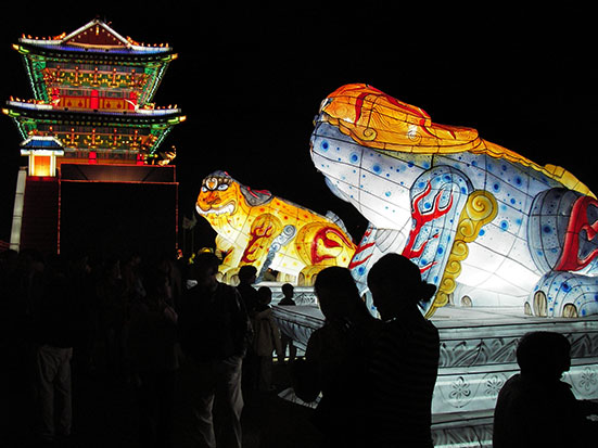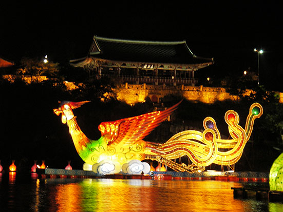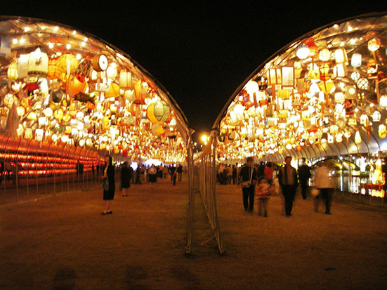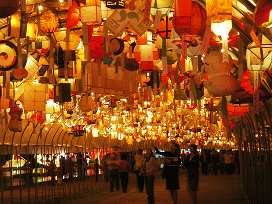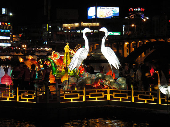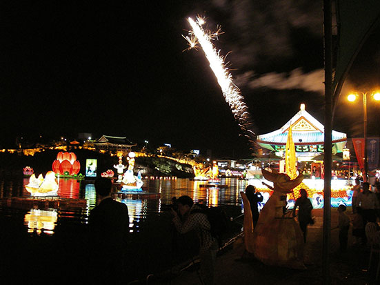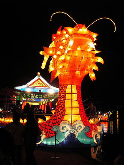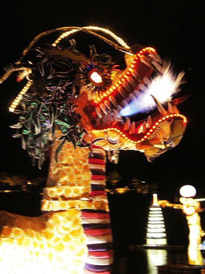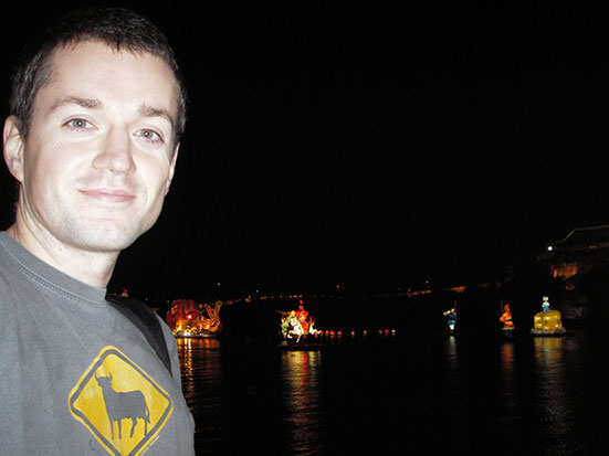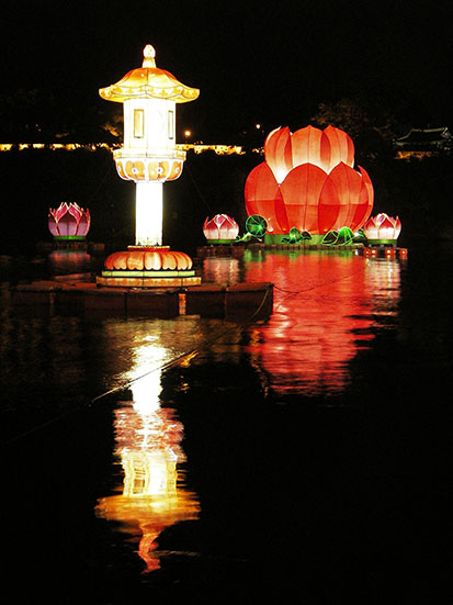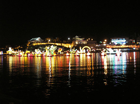 Am „Eingang“ des Fests, wurde ich abgesetzt. Inzwsichen war es sehr kalt, ich nur mit T-Shirt. So viele Leuchtfiguren, Lampions und Leute. Alles spiegelte sich nochmal im Wasser. Es sah super aus.