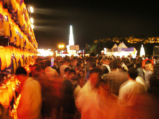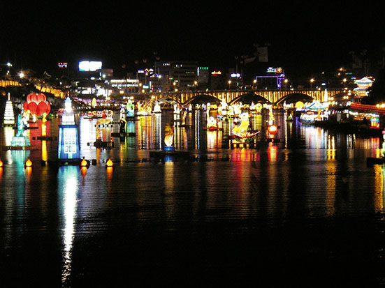 Ein Lichterfest sollte gerade stattfinden, ich erinnerte mich. So stieg ich in ein Taxi und versuchte mit Bildsprache das Fest zu beschreiben. Blinkende Lichter mit den Händen, dann hatte er’s. Zeigte es auch noch auf einer Broschüre, oh das wird cool. Richtung Innenstadt wurde es schöner. Zwischen Bäumen stahlten grüne Lampen, eine Konzertbühne und viele viele Menschen am Fluss.