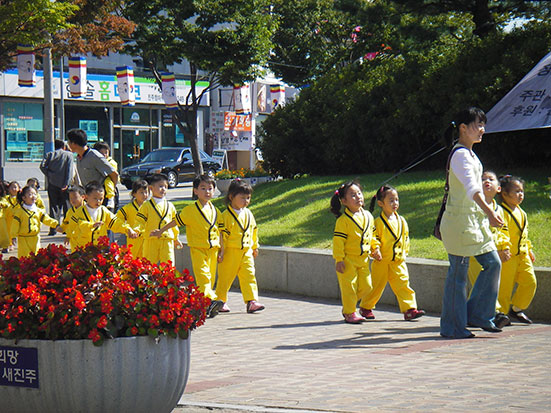 Das war sicher ein komisches Bild, kleine Koreaner in gelben Anzügen riefen wieder Hello und ich musste antworten. Schnauf, wieder unten, T-Shirt musste nun gewechselt werden.