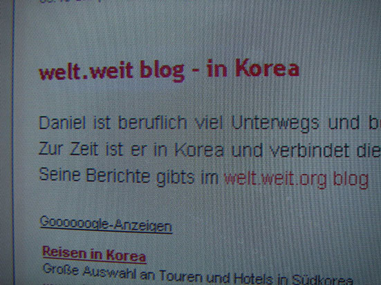 Wieder wollte ich auf der Korea-Blog Seite nach Interssantem schauen und entdeckte meine Site, gelinkt. Fühlte mich geehrt, gut gemeint aber die Sache hier ist dennoch etwas mehr privat und zu roh für die Öffentlichkeit. Entgegen der Natur des Webs wird’s ja nur (wenn überhaupt) von Leuten angeschaut, die mich persönlich kennen. So stellte ich das fix in ’ner email dar, vielleicht wird die Link dann wieder entfernt, ist aber auch egal. Hab ja vieles anonym gehalten und wer das liest ist selbst schuld. :-) Danke aber an Florian und viel Spaß weiterhin, falls du das liest. Habe mich gefreut, gut gemeint..