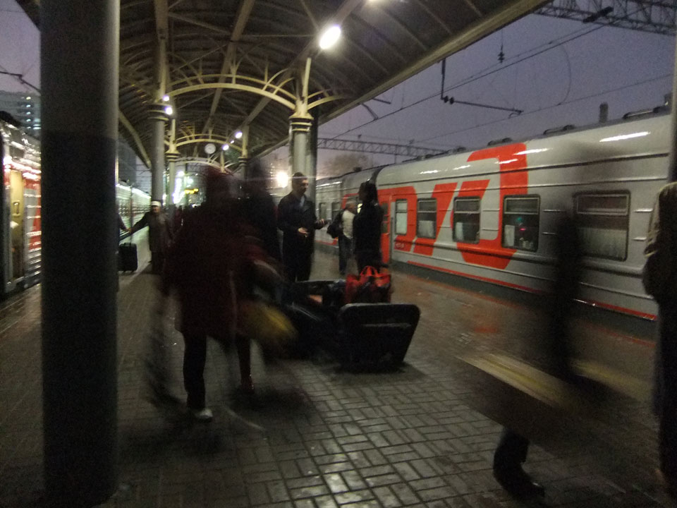 Auf dem Bahnhof, dann das Ticket aus dem Automaten und alles OK im Zug nach Moskau. Zunächst war’s zu warm und stickig, dann in der Nähe Moskaus extrem kalt durch die Klimaanlage. Es regnete in Strömen.