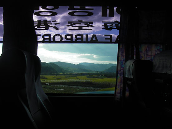 Die Station erste hatte nur Seoul und Busan aufm Plan. Glücklicherweise war die Inter City Version gleich nebenan. Ich sagte „Andong“ legte ’nen 10.000er ins Fenster und bekomme aufm Taschenrechner W 11.600 gezeigt. Das war doch ’ne Überreschung! Andong? War dan nicht in etwa eine Stunde entfernt? Der Bus fuhr schon 5 Minuten später. Fix rein und dann durch die Berge. An Ministädten stiegen Leute aus und zu. An einer Station war ich dann auf einmal der einzige. Der Busfahrer wusste, wohin ich wollte. Ich hoffe mal, ich auch. Es ging durch die Berge auf Kringelpfaden. Wie Neuseeland nur alles viel viel höher und bewaldet. Bauern ernteten die Körner und trockneten sie am Straßenrand. So kam ich dann 3 Stunden später erst in Andong an.