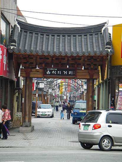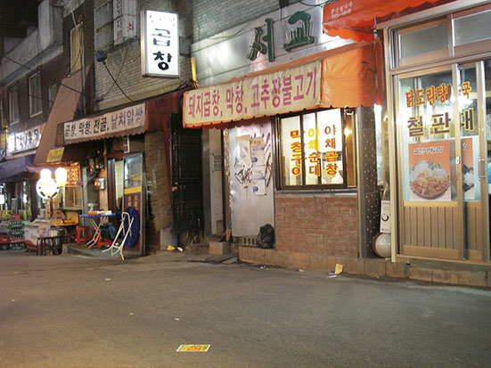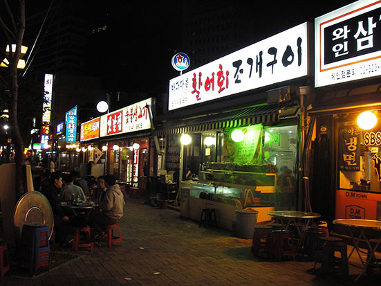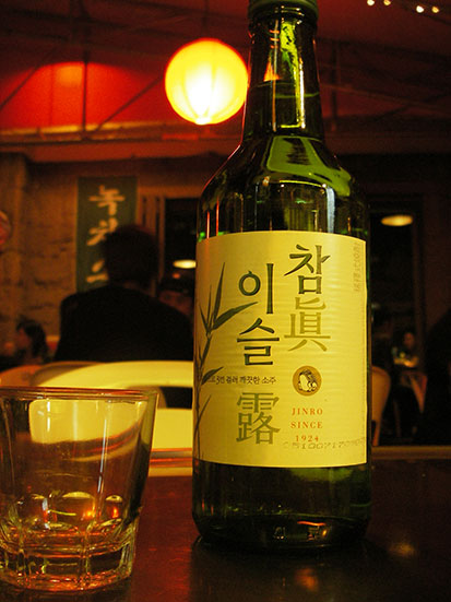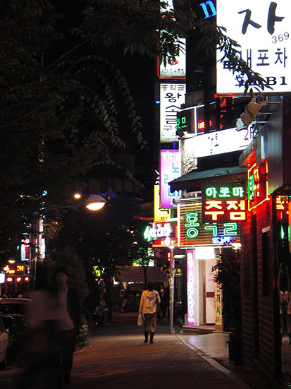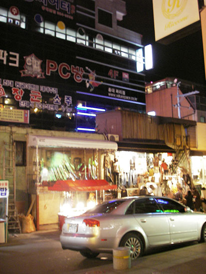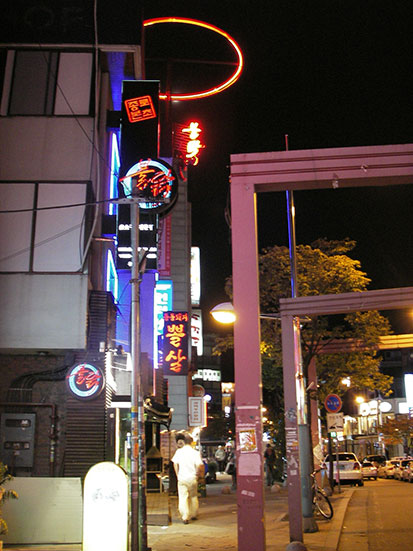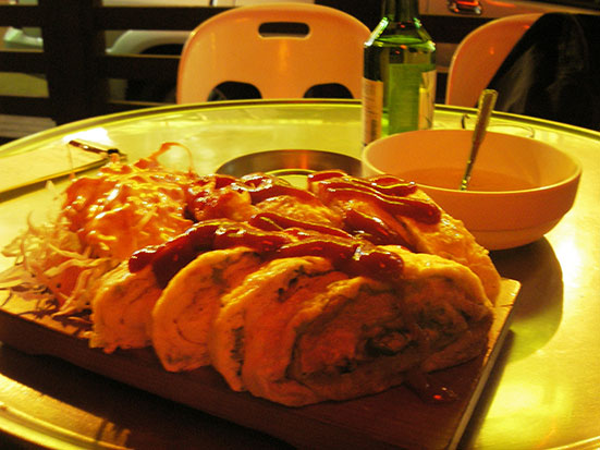 Nur wenige Leute sind im Haus, morgen sollte es voll werden. Abends ging ich nochmal los. Die Uni-Gegend in Haeundae liegt gleich in der Nähe und da war zum Freitag auch einiges los. In einer Bar bestellte ich was zu Essen, nach Auswahl des Kellners. Ich bekam eine dicke Omelettrolle (W 3.000) und eine Flasche Soju (W 8.000). Der Wein war stark und ich habe noch nie soviel Ei auf einmal gegessen.