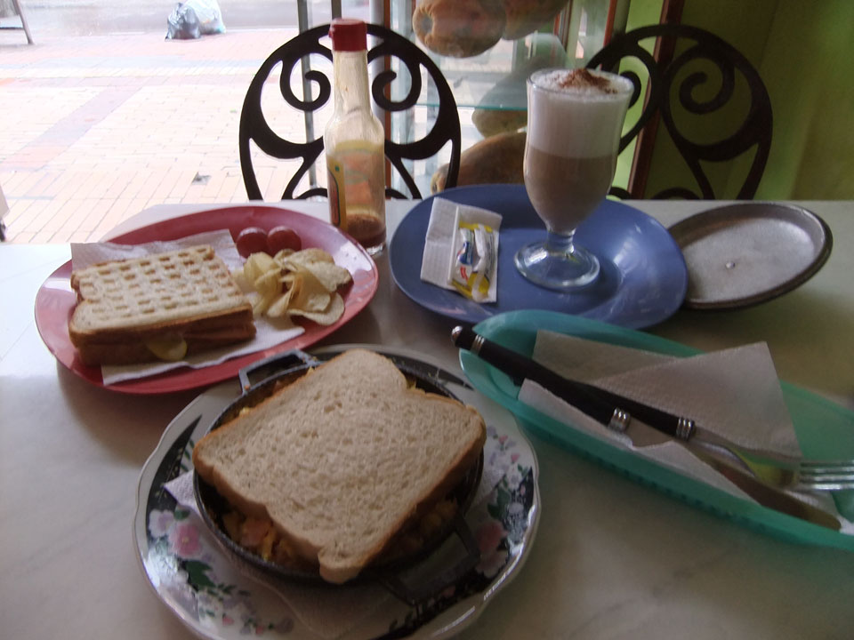Mit einer Stunde Verspätung checkte ich aus. Für die Wäsche zahlte ich noch heftige COP 25.000 (€11). Dann etwas durch die Straßen und was essen. Ein exzellentes Frühstück und den Regen abgewartet.