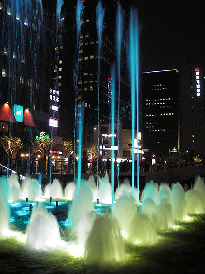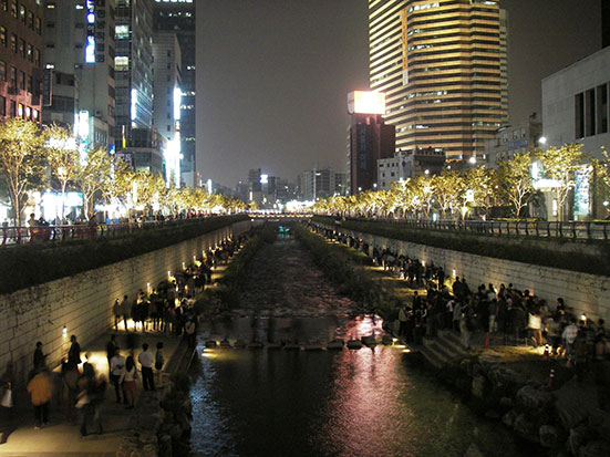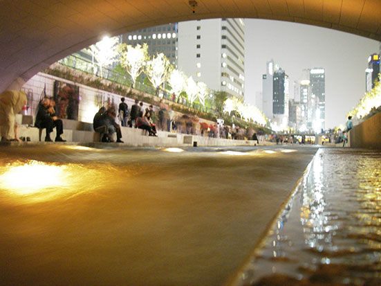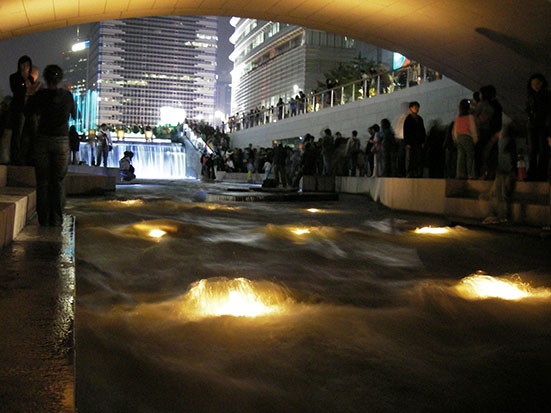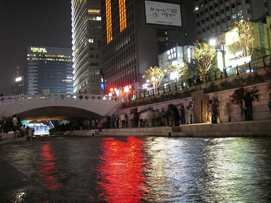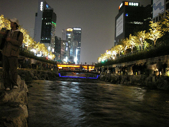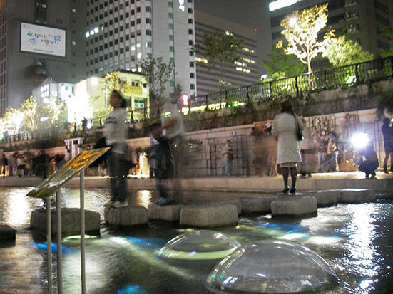 Weiter zum Cheongyecheon Fluss, weil gleich in der Nähe. Ein paar Photos zeigten, wie er in der n 40’er und 50’er Jahren aussah, bevor er zubetoniert wurde. Viele Leute liefen da herum. Die Locals sind scheinbar ganz verrückt nach dem neuen alten Fluss. Die Kameras blitzten an allen Ecken, viele waren ach mit Stativ unterwegs. Auch hier konnte man über Steine hüpfen.