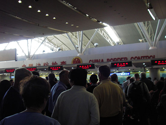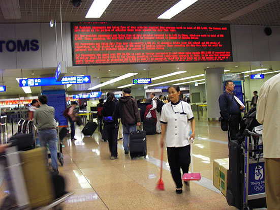 Der Flug war mit 1:40 nur ein kleiner Hüpfer. Das Essen war reichlich und sehr gut, alles bestens. 3 Formulare (Zoll, Gesundheit, Immigration) mussten ausgefüllt werden. In Peking hieß es erst mal Warten. In Schlangen wurden Locals und Ausländer vorsortiert. Ich ging in eine Schlange mit viele Asiaten, was sich als super erwies. Es ging etwas schneller als mit den Amerikanern. Gepäck und Geld geholt, jetzt hatte ich viel Zeit.