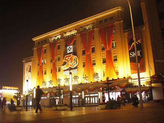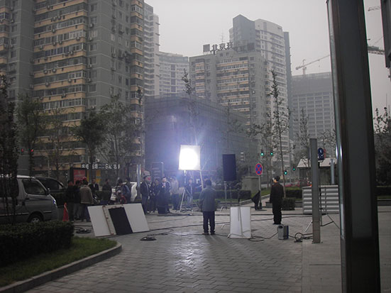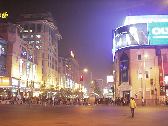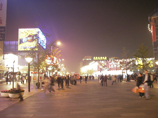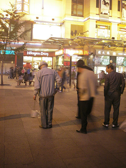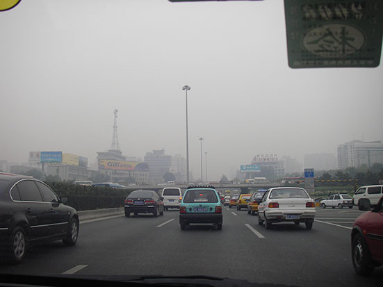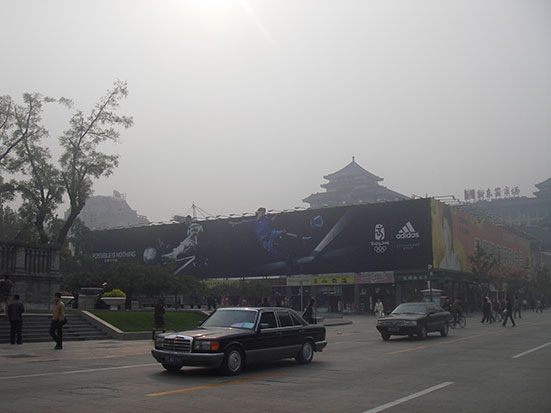 Die Gegend hier ist aber toll. Es gibt eine Einkaufsstraße, die teils nur Fußgängerzone ist. Sonst brausen um einen die Autos und Radler umher – hier kann man mal entspannt laufen. Das Wetter war diesig – viellicht auch nur Smog. Peking ist ja die Stadt mit der schlechtesten Luft weltweit.