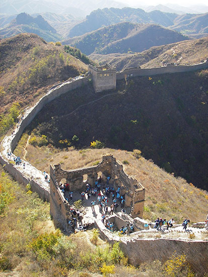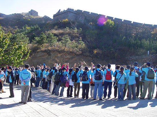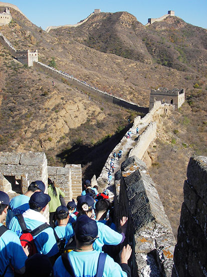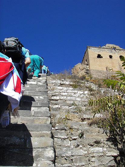 Erstmal ein Ticket kaufen (RMB 30) und dann hoch. Auf dem Vorplatz fand gerade eine Gruppenzeremonie statt. Ein Unternehmen (Tyco Electronics) hatte gut 500 Leute eingeladen, die jetzt auch die gleiche Strecke zurücklegen wollten. Na sowas. Mit bissel Vorsprung starteten wir für einer Horde mit blauen T-Shirts.