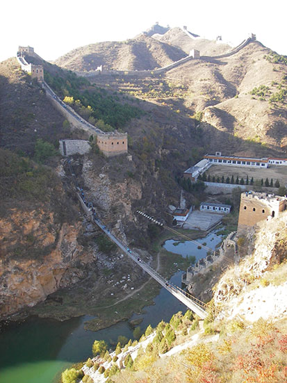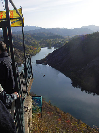 In Simatai ging s über eine Hängebrücke (RMB 5) und als Alternativabstieg auch per „Flying Fox“ , also am Drahtseil, nach unten (RMB 35). Natürlich wollte ich das machen und der Kassierer fragte mich noch, ob ich mit dem Bus sei. Klar und alles schien OK – gegen 15:30 zeigte die Watch aber schon. Nun dauerte die ganze Geschichte doch 30′-45′ lämnger als gedacht. Gegen 16:15 war ich dann in der Luft und mit Schwung nach unten. Kurzer schöner Spaß.
