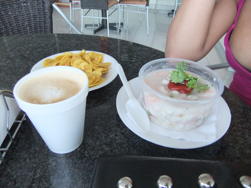 Wir gingen baden, dann unter die Dusche und fuhren zum Flughafen. Viel zu zeitig da – mehr als 2h vor Abflug gab’s nochmal was zu essen und Ceviche, leider kein Internet. Die Extra-Zeit in Manta hätte noch länger sein können, ich plante 30′ zu viel ein.