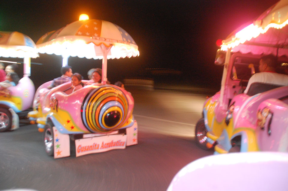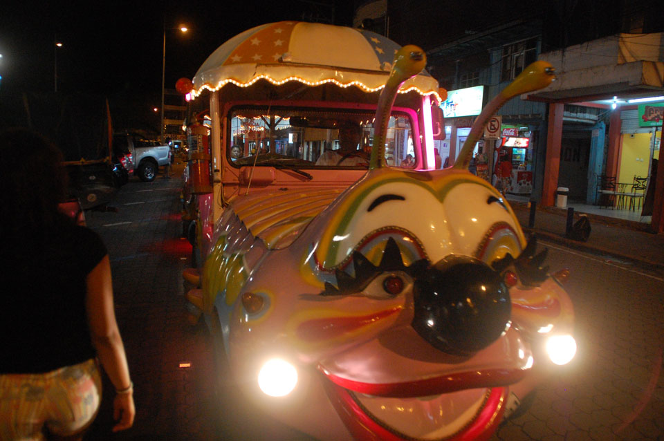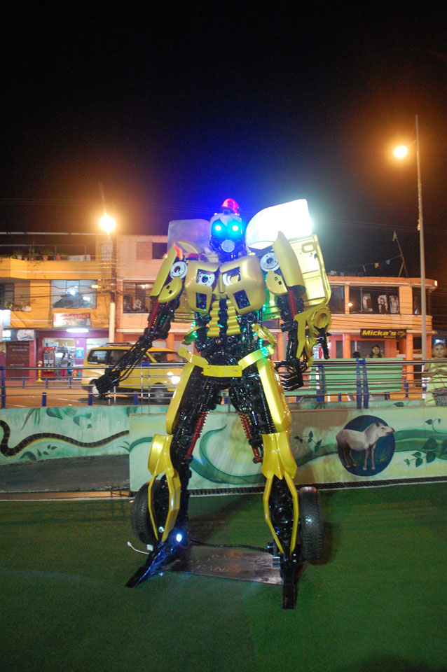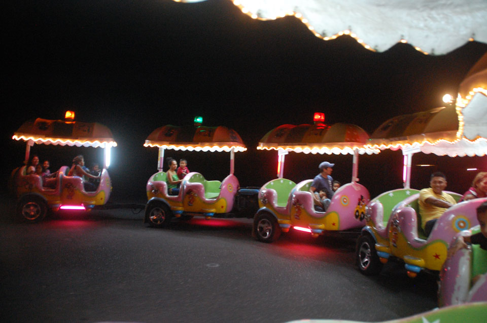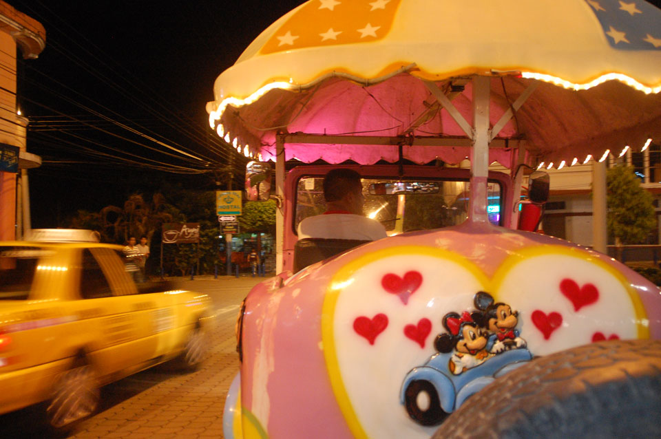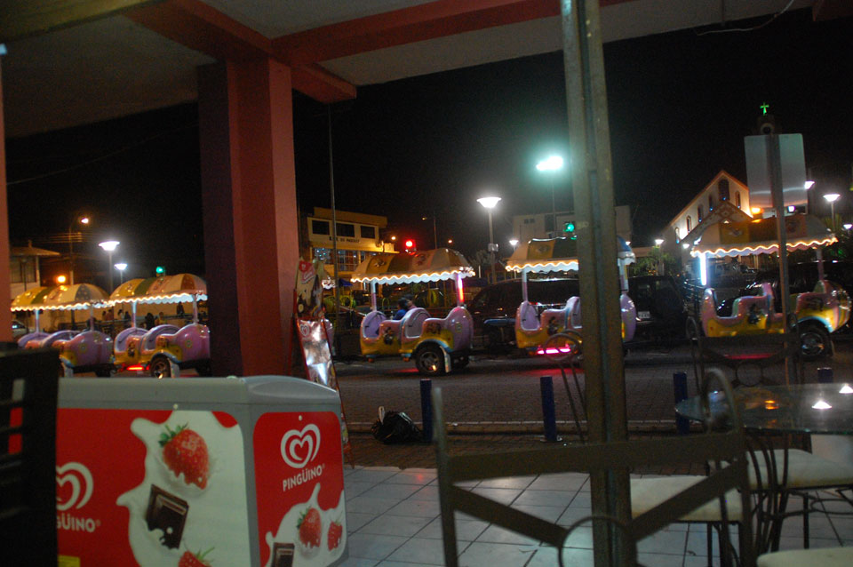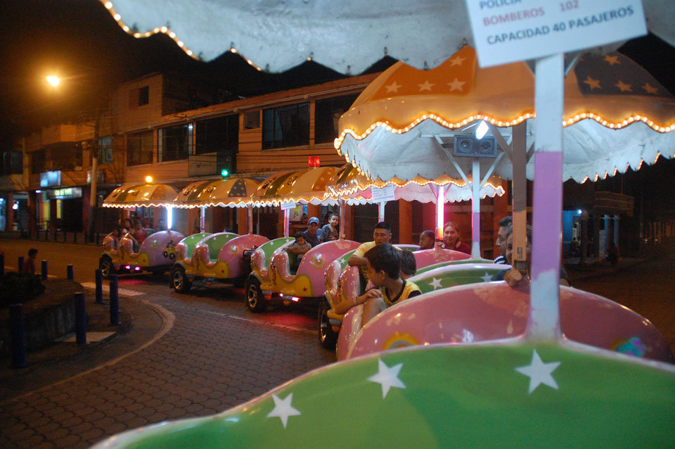 Abends dann mal raus. Zuerst was essen in einem chinesischen Chifa. Ich hatte Chop Suey. Wir spazierten die Hauptstraßen entlang und kamen am Ende zu einem Spielplatz vor der Kirche. Da war ein Transformer Roboter aufgestellt. Ein langer Kinderzug – hier Gusanito stand dann auch bereit für eine kleine Rundfahrt durch Puyo. Für 2 x $1 ein nettes Vergnügen, dachte ich mir. Eigentlich nur für Kinder gedacht, saßen wir im ersten Wagen und die Fahrt ging los.