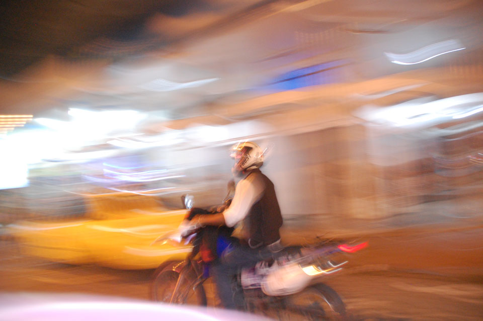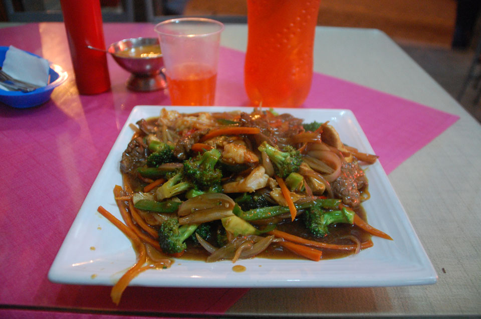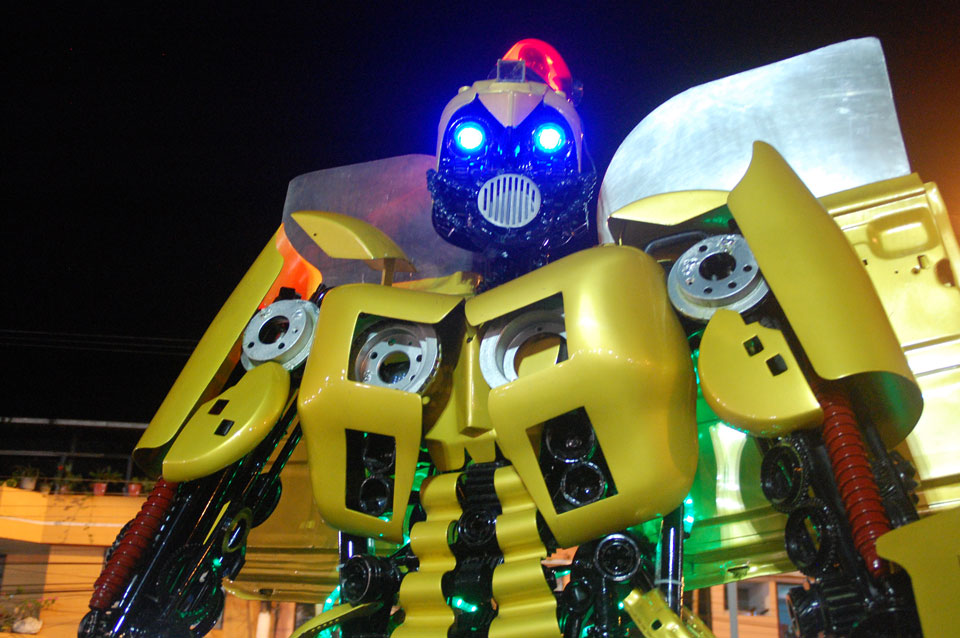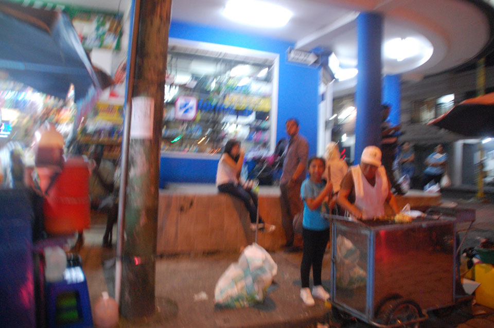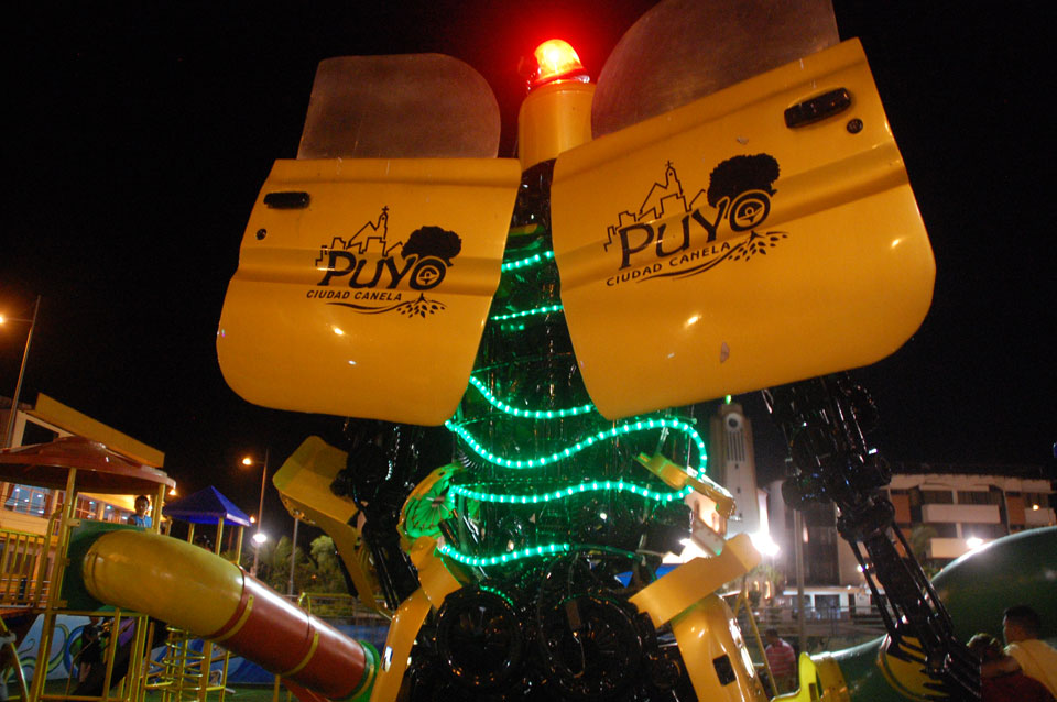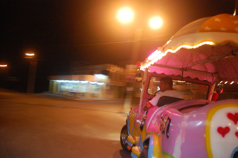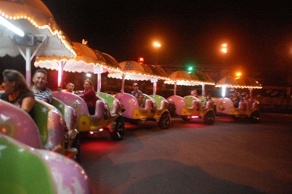 Abends dann mal raus. Zuerst was essen in einem chinesischen Chifa. Ich hatte Chop Suey. Wir spazierten die Hauptstraßen entlang und kamen am Ende zu einem Spielplatz vor der Kirche. Da war ein Transformer Roboter aufgestellt. Ein langer Kinderzug – hier Gusanito stand dann auch bereit für eine kleine Rundfahrt durch Puyo. Für 2 x $1 ein nettes Vergnügen, dachte ich mir. Eigentlich nur für Kinder gedacht, saßen wir im ersten Wagen und die Fahrt ging los.