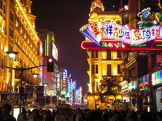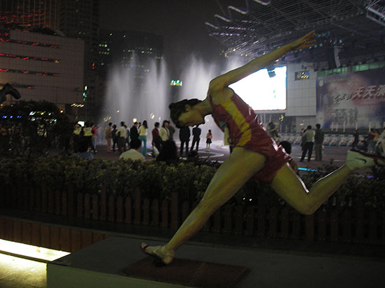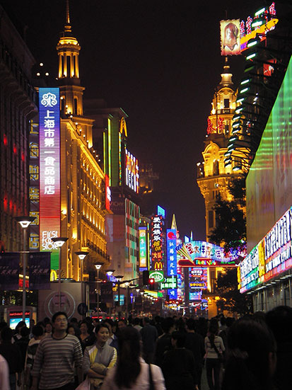 Die Nanjing Rd entlang wieder zurück zum Hostel. Viele Lichter zum Freitag Abend. Springbrunnen zu Musik und ein paar Geschäftemacher drum herum. Obwohl man als Ausländer besonders oft angequatscht wird, ist es ingesamt ganz angenehm hier. Die Leute sind Foreigners seit Langem gewohnt, sodass man nichts Besonderes ist und nicht ständig angestarrt wird, wie anderswo. Ich kaufte mir ’ne Jeans, da ich meine Wäsche noch nicht wieder waschen konnte.