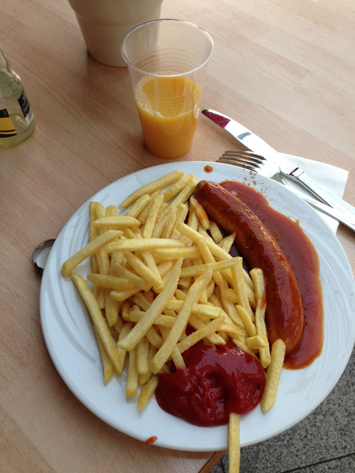 Da nickte ich einige Male weg. In Dortmund dann warten auf den Bus. Hunger: Currywurst mit Pommes und klinem O-Saft für €10. Willkommen im Westen. Der Bus zum Hbf €7 aber mein Bahn.Ticket war ja billig. Ich hatte mir Internet auf simyo geholt, die MMS Daten händisch in’s iPhone eingetragen. Dann mein Bahnticket per MMS zuschicken lassen, was heute endlich klappte.