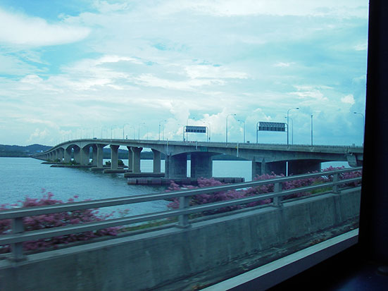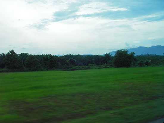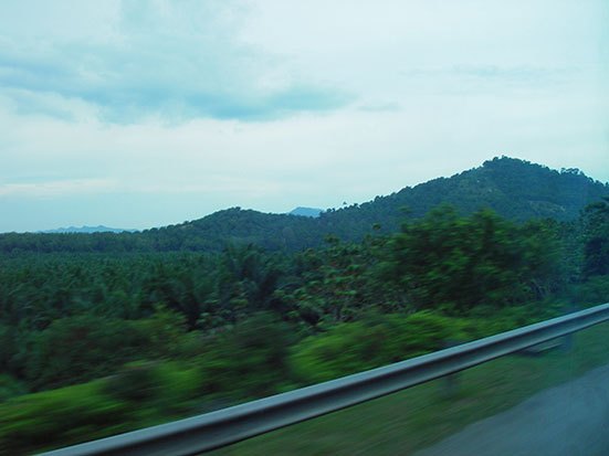 Nach nicht mal einer Stunde waren wir schon am ersten Checkpoint. Aussteigen und Ausreisestempel abholen. Ein paar hundert Meter weiter das gleiche in grün – malayische Seite. Nun mussten alle mit komplettem Gepäck über die Grenze. Einreisekarte für gut befunden und weiter. Weiter, weiter, weiter, – immer vorbei an grünen Palmen und Wäldern. Schön anders und bedeckt. Ab und zu wurde mal für Snacks angehalten. Ohne Malayisches Geld knabberte ich erst mal die guten Kekse zu Ende. Dank Überklimatisierung war ich auch froh über mein chinesisches Kapuzenshirt. So war alles besten. Die Fahrt war lang.
