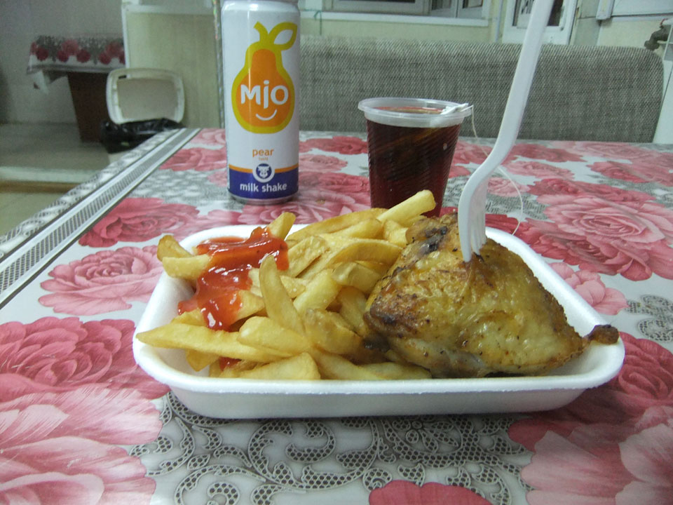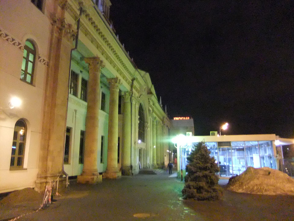 Da holte ich mir ein paar Pommes, Huhn und saß da. Die Pommes von vorgestern aber erst mal egal. Ungesunde Ernährung seit ein paar Tagen, wie das so auf Reisen ist. Ein obdachloser kam in die Kantine, wollte Geld. Das Gesicht war irre zerknüllt, dreckig, offener Hosenstall – mit der irrste Russe, den ich bisher so sah. Er wurde rausgescheucht und so hatte ich auch wieder Ruhe. Gegen 5 in der Frühe ist das Publikum ein anderes.