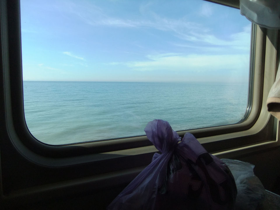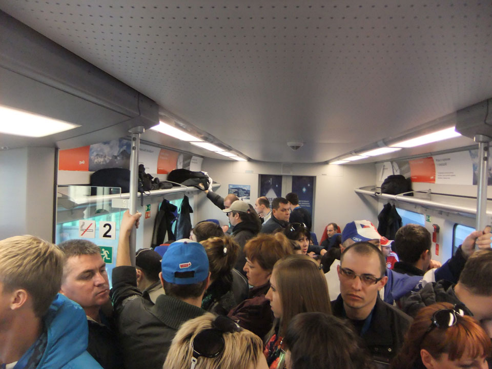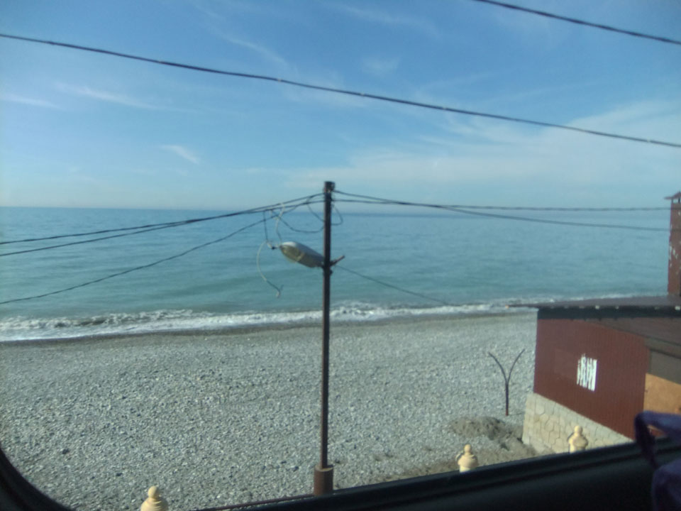 Sehr freundlich und die Leute sind echt stolz auf die Spiele, so irre die auch sind. Wir irre sah ich dann als ich aufwachte und der Zug am schwarzen Meer entlang fuhr. Da fährt man am Kieselstrand bei strahlendem Sonnenschein am Wasser entlang. Das ist weit weg von Winterspielen und eben das „paradox“ wie sie sagte. In Sochi dann stiegen die meisten Leute aus und ich wartete .. und wartete. Es kam eine Durchsage mit „sorok minut“ – fragte nach – ja, 40 Minuten Wartezeit.