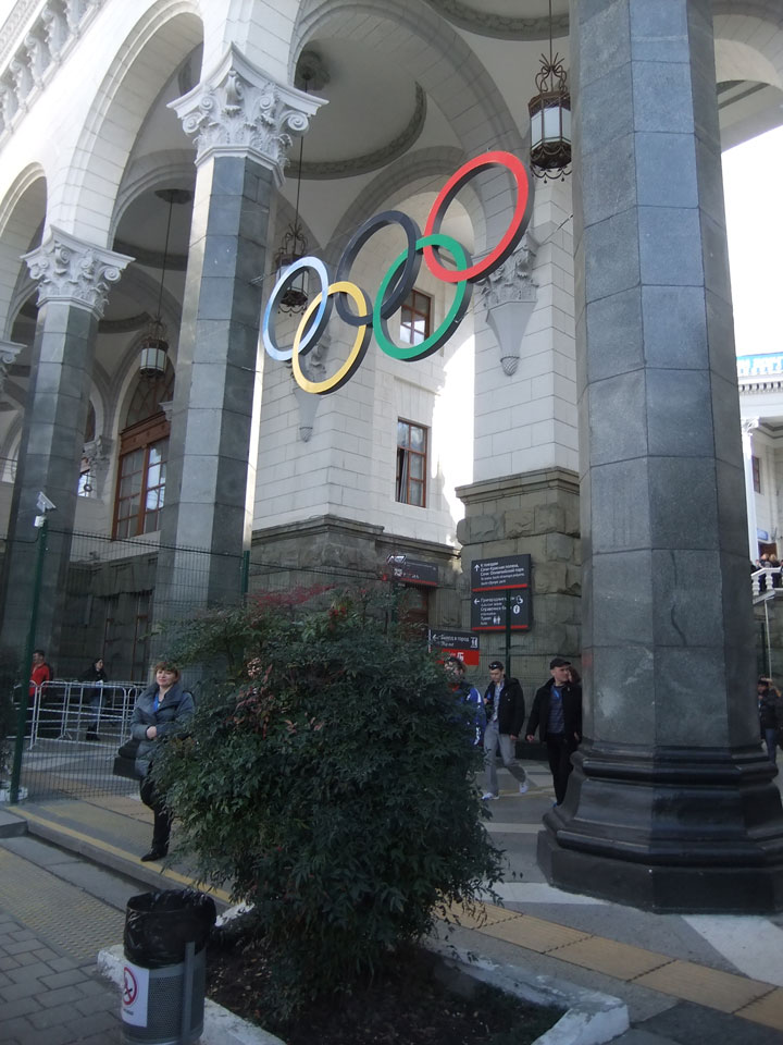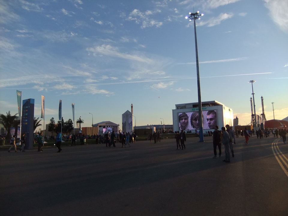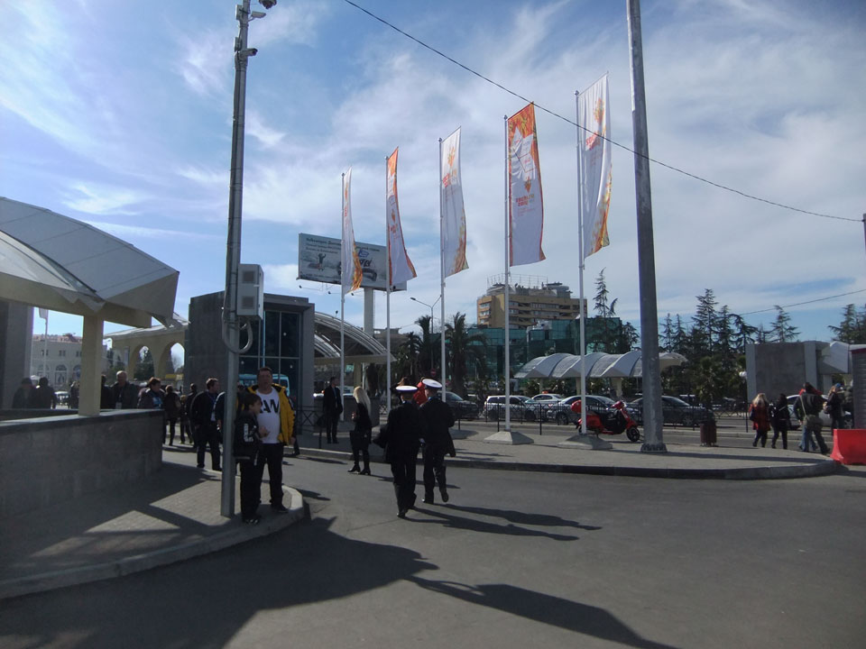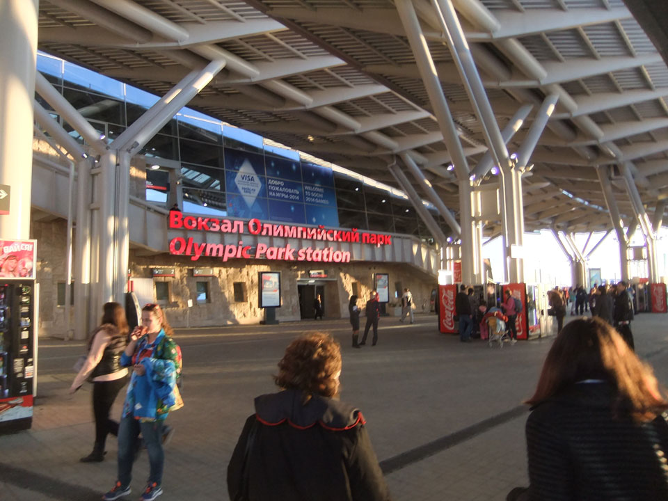 Ich musste meine Tickets abholen und hatte die fixe Idee, dass ich das während dieser 40 Minuten machen sollte. Also ging ich raus aus dem Bahnhof und sah die Sicherheitshallen, wollte zum Ticketcenter. Das war aber hinter der Sicherheitszone und nach Adler, Olympischer Park ging da nur durch. Nur eben nicht für mich, weil der Eintritt nur mit kleinem Gepäck erlaubt ist – auch ohne Getränke, Essereien usw.. Ich sollte die Sachen ohnehin in Adler abholen, da hier die Leute über 2 Stunden stehen. So hatte ich den ersten Dämpfer mit der Organisation. Russisches Schlangestehen und wenig English. Die Leute waren aber hilfsbereit und ich stieg in den Bus nach Adler- RUB 70. Sehr warm mit meiner dicken Jacke – um die 20 Grad sicher draußen.