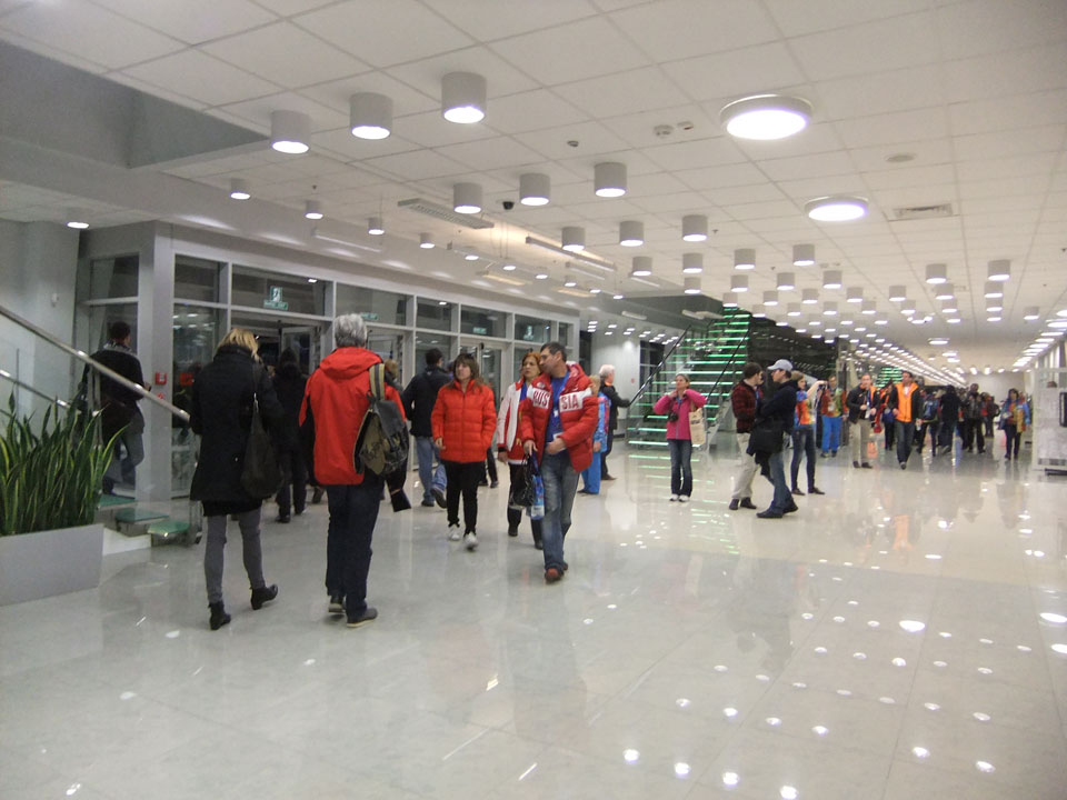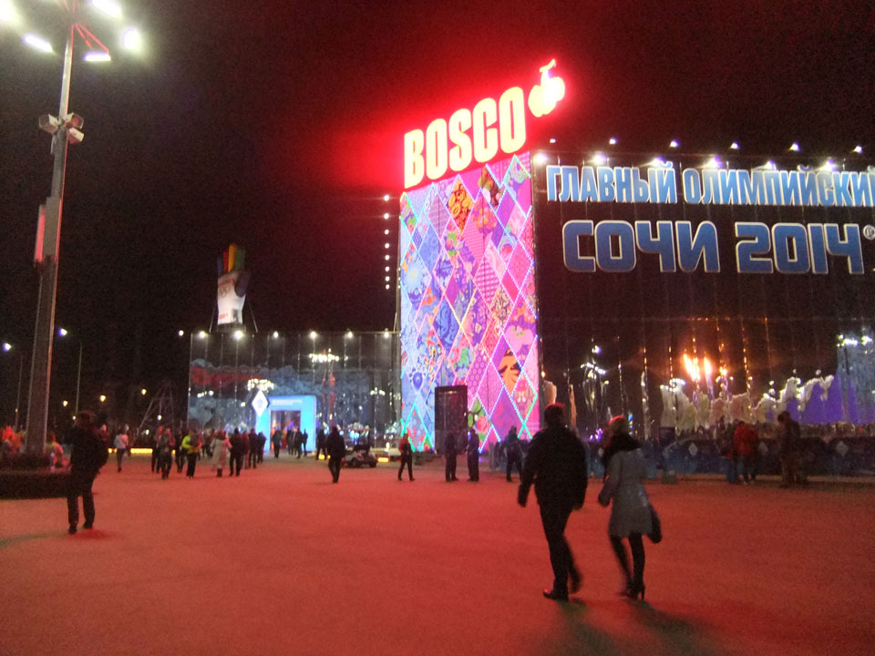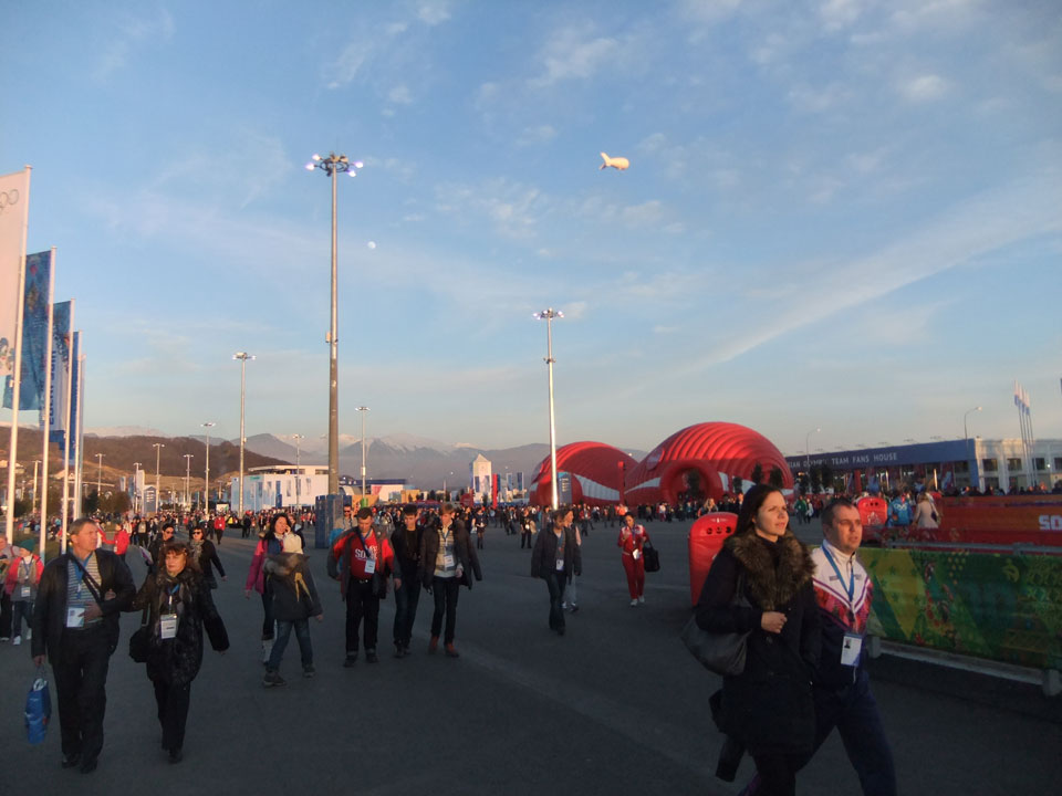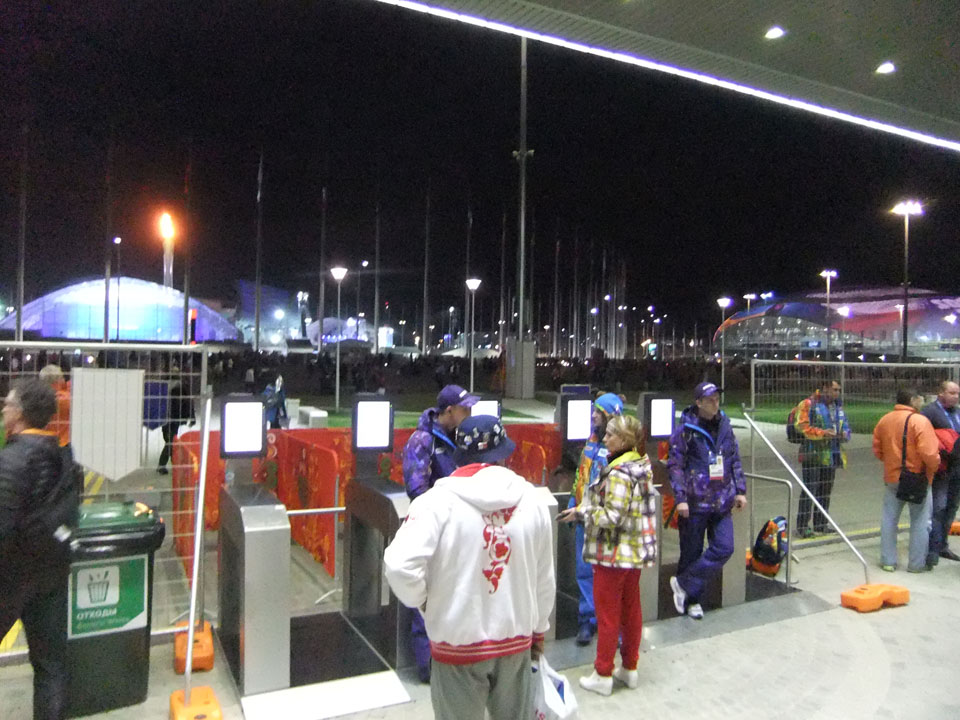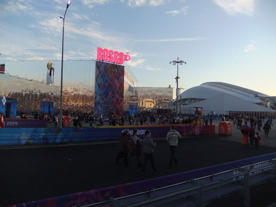 Ich musste meine Tickets abholen und hatte die fixe Idee, dass ich das während dieser 40 Minuten machen sollte. Also ging ich raus aus dem Bahnhof und sah die Sicherheitshallen, wollte zum Ticketcenter. Das war aber hinter der Sicherheitszone und nach Adler, Olympischer Park ging da nur durch. Nur eben nicht für mich, weil der Eintritt nur mit kleinem Gepäck erlaubt ist – auch ohne Getränke, Essereien usw.. Ich sollte die Sachen ohnehin in Adler abholen, da hier die Leute über 2 Stunden stehen. So hatte ich den ersten Dämpfer mit der Organisation. Russisches Schlangestehen und wenig English. Die Leute waren aber hilfsbereit und ich stieg in den Bus nach Adler- RUB 70. Sehr warm mit meiner dicken Jacke – um die 20 Grad sicher draußen.