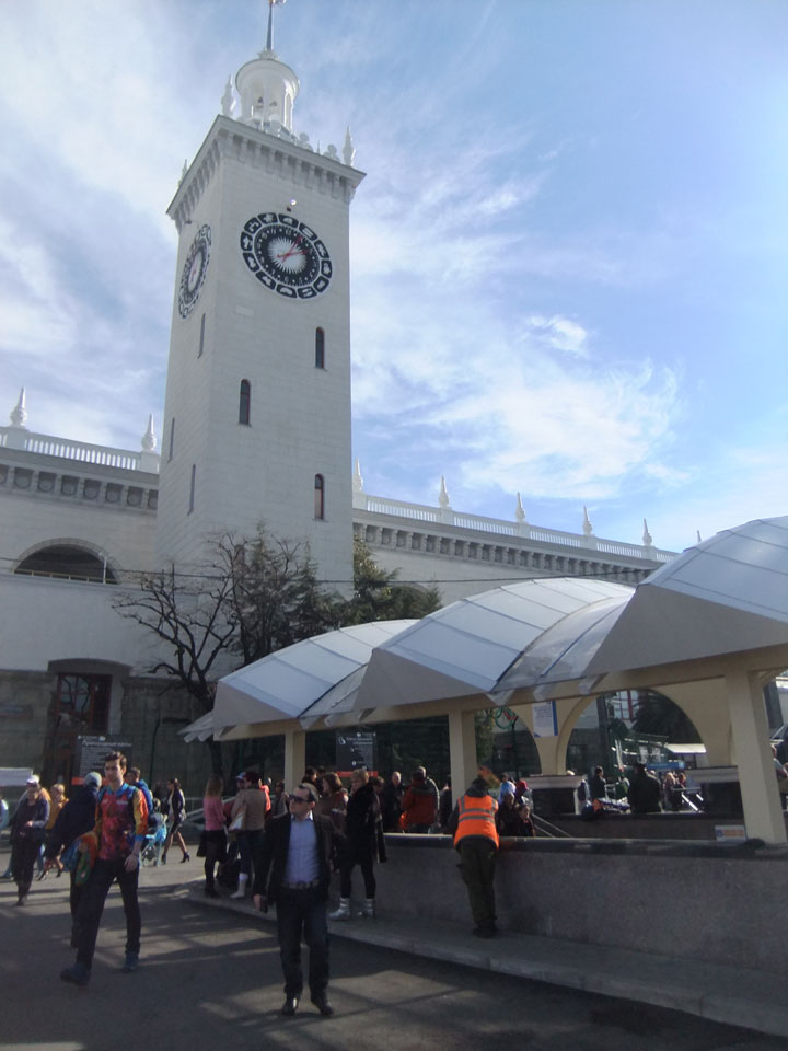 Die oberste Etage eines Neubaublocks war also das Hostel und das war dann eine Baustelle. Eine etwas ärgerliche Japanerin saß da in einem leeren großen Zimmer. Der Administrator sei gerade nicht da. Ich bekam mein Bett, sprang unter die Dusche und war so in ca. 15′ wieder draußen. Cameras, Pass und Geld – ich musste zum Bahnhof in Adler, wo es Tickets und den Pass gab.
