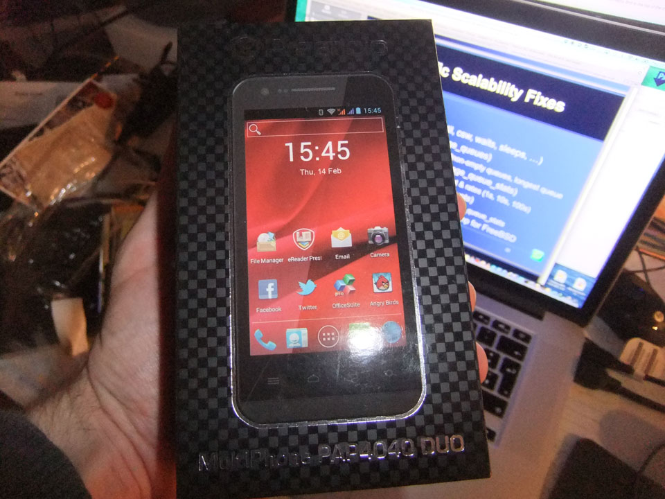Die zwei Billighandies waren da. Prestigio Duphone 4040. Eins machte ich dann doch auf und nahm es für mich. Das zweite sollte mit nach Quito gehen.