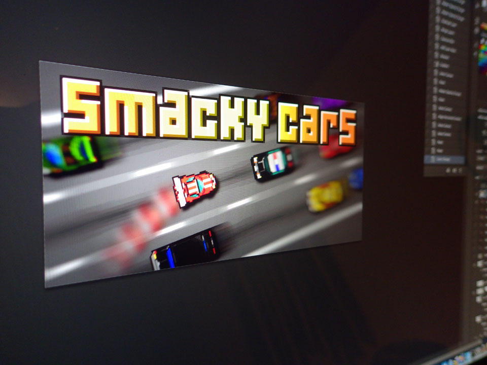 Abends schaffte ich sogar die Promo-Graphik für das Smacky Cars Spiel zu machen. Ich war am Ende doch ganz zufrieden damit – 1024×500 px aus den paar Graphiken des Spiels. Viele Filter und Blur und fertig war’s. Dem Kunden gefiel das auch.