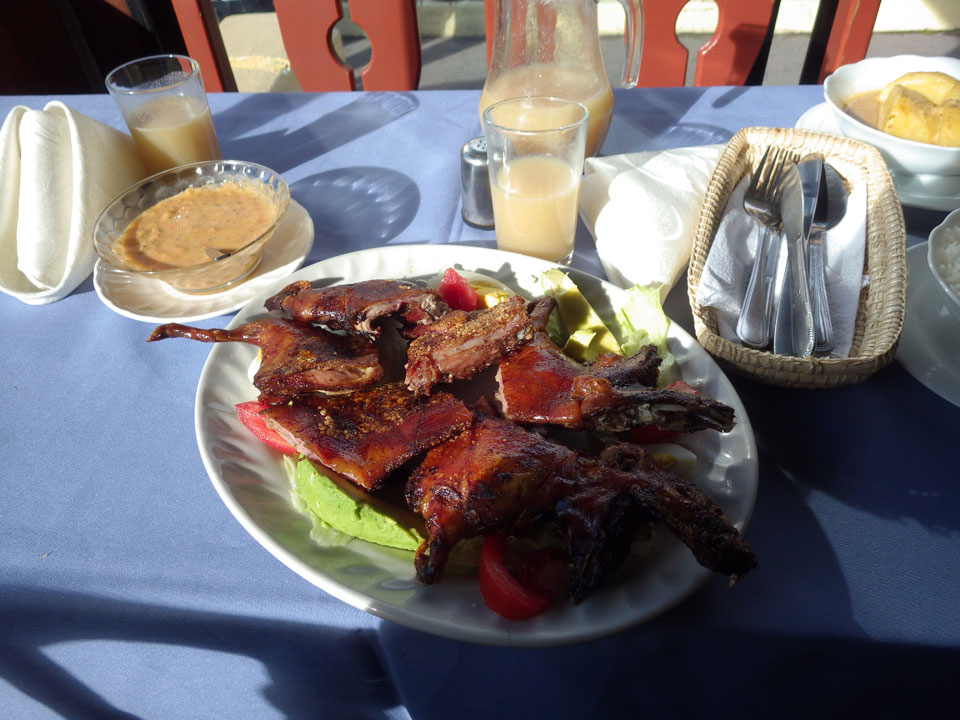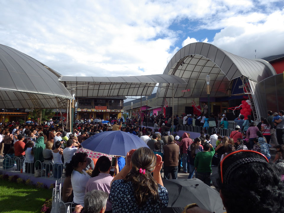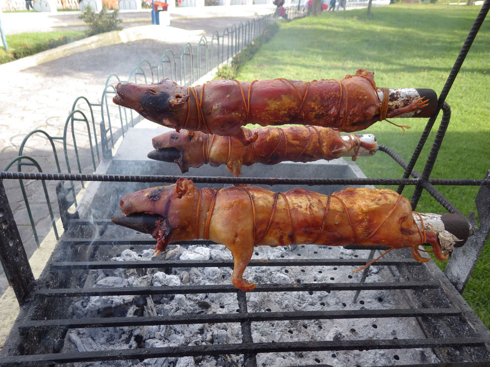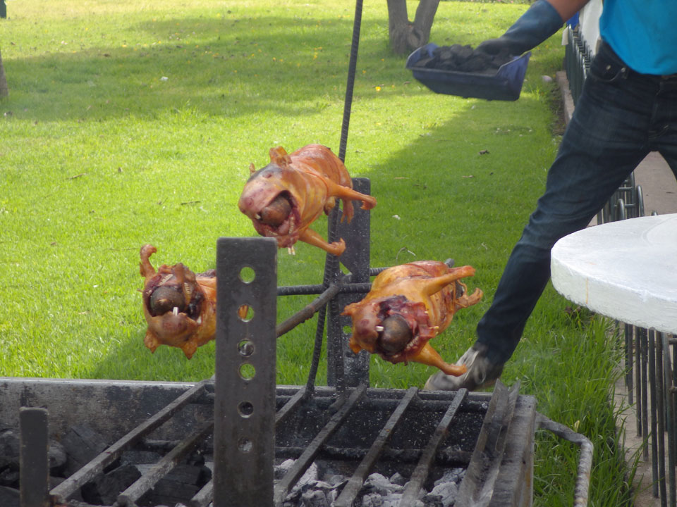 Dort war alles ganz nett. Musik und viele Leute. Wir drehten eine Runde, eine zwete für ’ne Zeitraffer-Aufnahme und hatten eine nette Zeit. Jemand freute sich schon seit Tagen auf Cuy – Meerschweinchen, was eben hier als Delikatesse gilt. Am Eingang hatten sie einige auf dem Grill. Dann als wir nach Hause gehen wollten, kehrten wir doch in einem Restaurant dort ein. Das Essen ist nicht gerade preiswert. Das Cuy kostete $25, reicht zwar für zwei. Dazu noch Chicha und die Steuern. Meine $80, die ich mit hatte wurden so mit dem ganzen Taxi, Eintritt und eben essen fast aufgebraucht. Zurück fuhren wir deshalb mit dem Bus – über eine Stunde für $0.40 pro Nase. Den Rest dann mit dem Taxi.