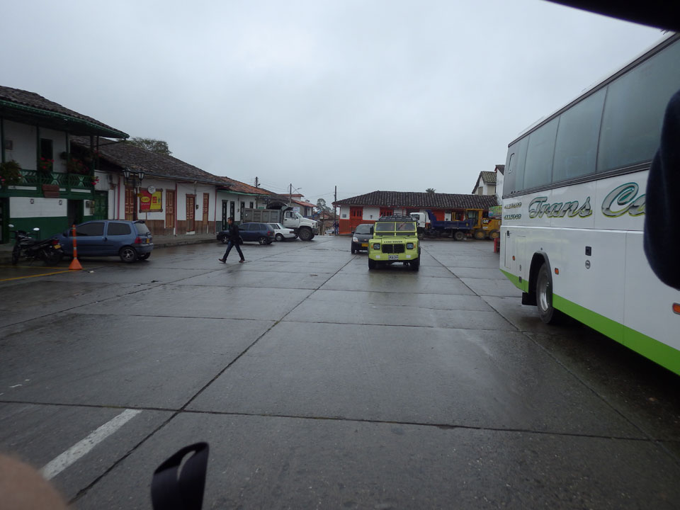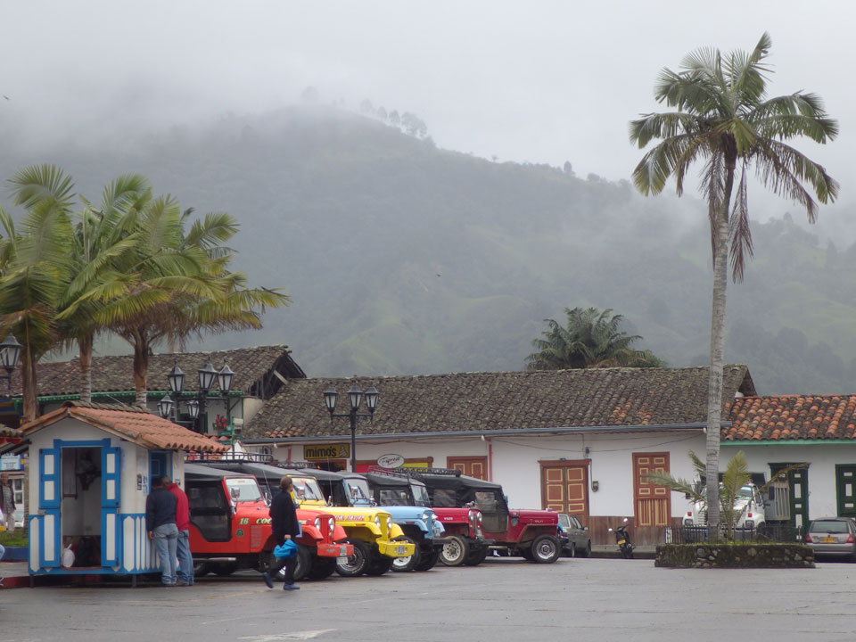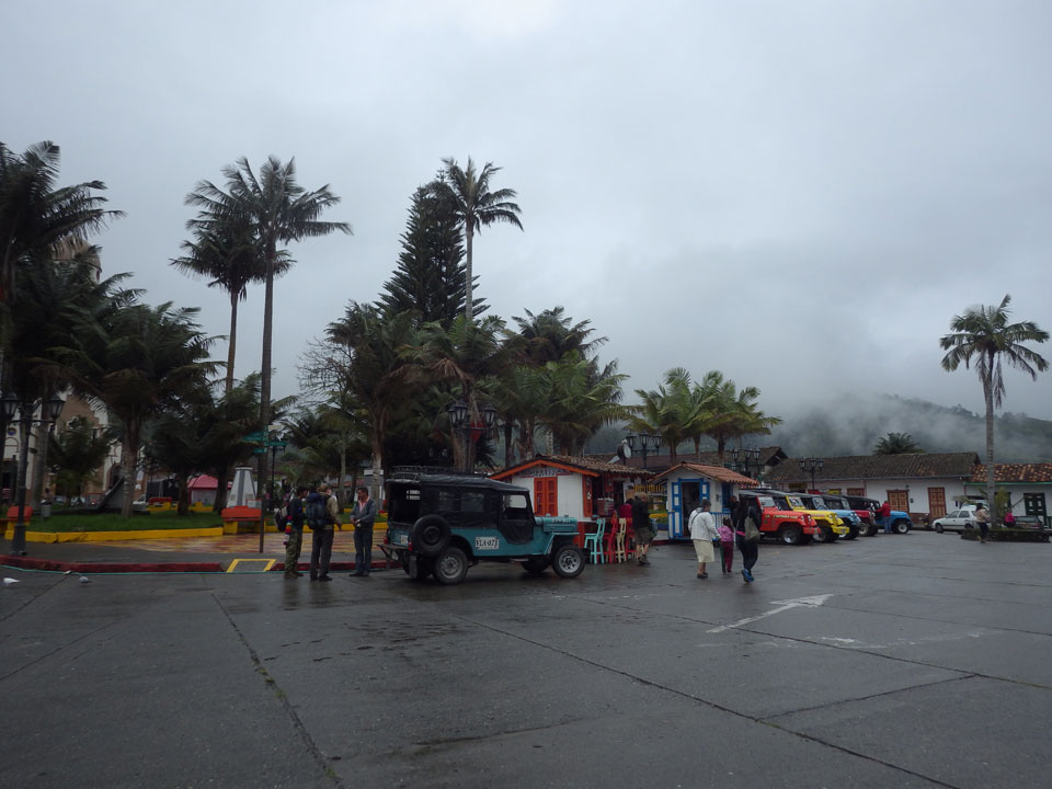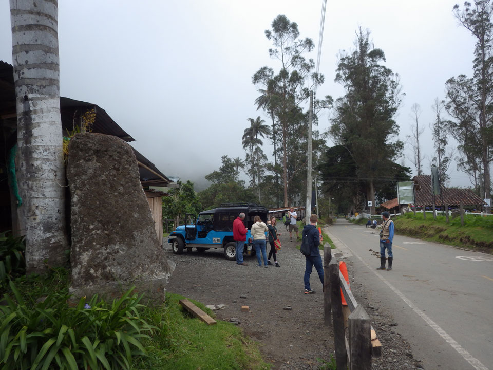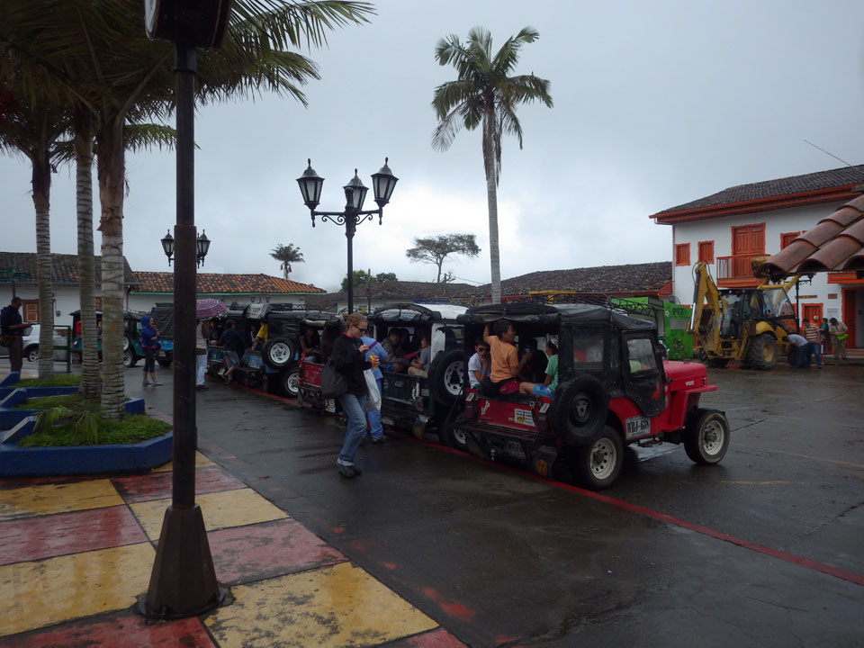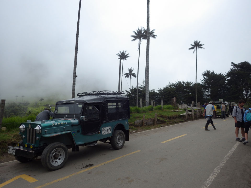 Das Valle de Cocora stand an. Um 9:30 fuhren die Jeeps und nach 9 bekam ich noch schnell ein Frühstück. Sehr gut und dann zum Plaza, wo schon die Touristen in den Jeeps standen. Das Wetter heute nieselig. In einem der letzten Jeeps dann mit 4 Leuten pro Reihe war es eng aber die Fahrt auch recht kurz.