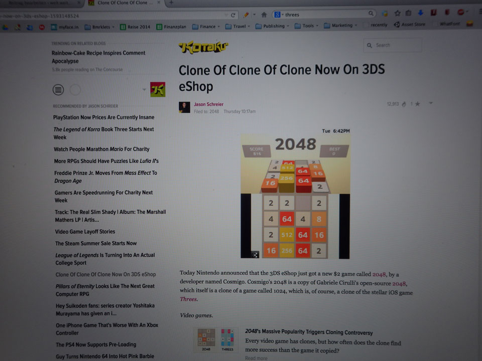 Ich bekam die neueste Version von der 2048 EU Version heute und bin gespannt, wie sich Presse überhaupt auf Verkaufszahlen auswirken. Werde ich morgen sehen, ob der Kotaku Artikel was bringt. Am liebsten würde ich auch Threes portieren. Der Entwickler wird bissel verärgert sein und so lasse ich das mal, frage vielleicht später.