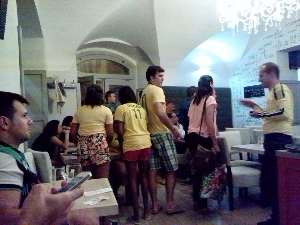 Später am Abend wollte ich mit ’nem Russen aus Kaliningrad was essen und drinken gehen. Um 23:00 machten viele Restaurants schon zu. Wir fanden dann doch noch was, wo Brasilianer und Kolumbianer dem zweiten Achtelfinal-Spiel heute zuschauten. Die Brasilianer waren dann vollkommen aus dem Häuschen. Ich redete dann noch mit dem Russen über Meditation, ahnte schon, dass er da auch einige Erfahrungen hatte. Um 1:30 verschwand ich zum Roxy. Musik und Party war gut. Na gut, aus dem Alter raus aber immer noch nett und besser als Karlove Lazne.