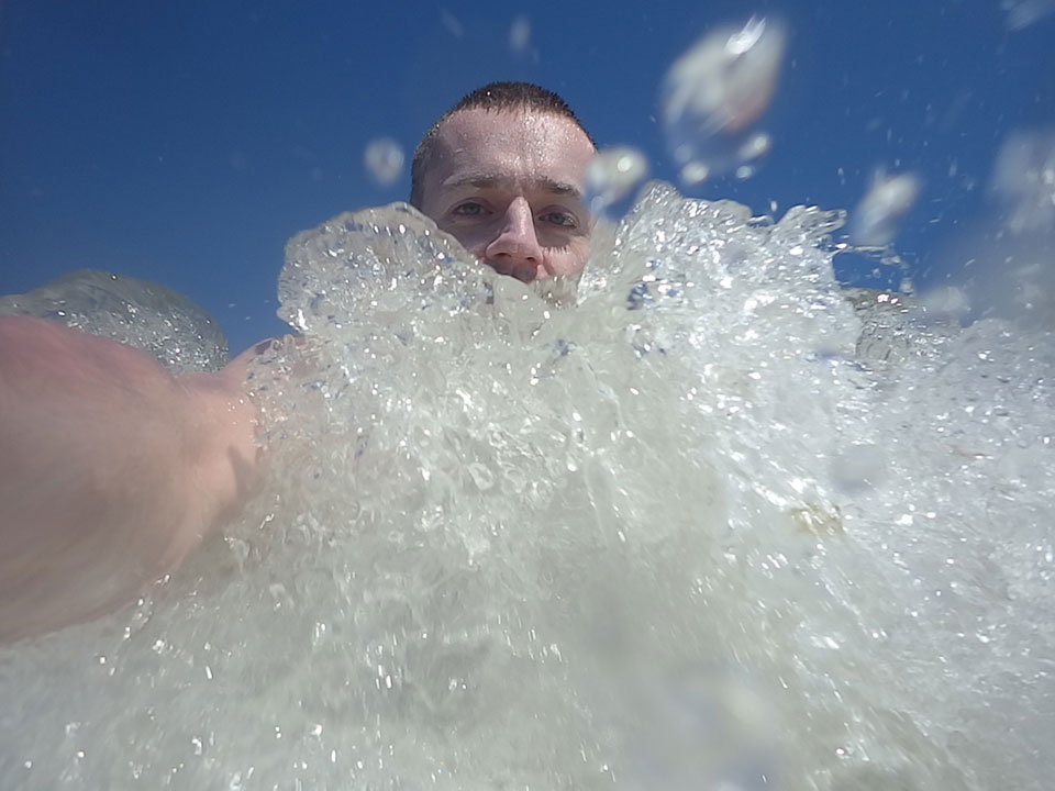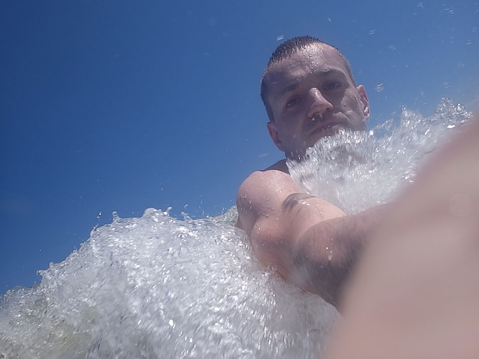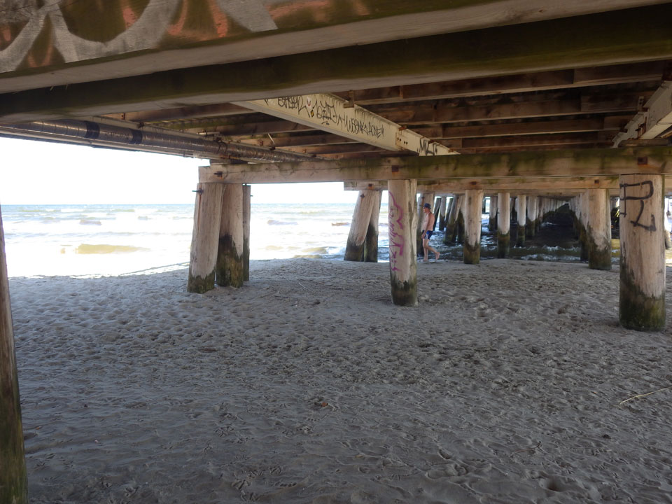 Bis 10:30 schaffte ich sogar das Frühstück. Nur 5 Stunden Schlaf aber der Brasilianer war auch wach. Wir gingen an den Strand. Nördlich vom Holzsteg ist der Strand sauberer. Baden und viel Sonne – geschützt mit SPF 60.