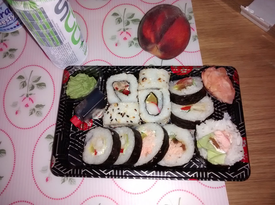 Erst im Dunkeln ging ich noch eine kleine Runde joggen. Danach ein große Sushi aus dem Supermarkt. Hier ernähre ich mich ganz gesund.