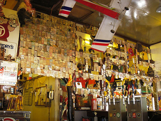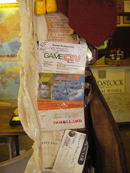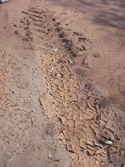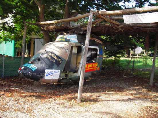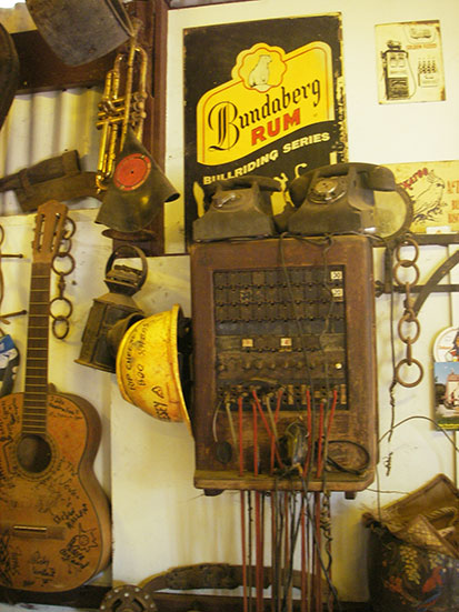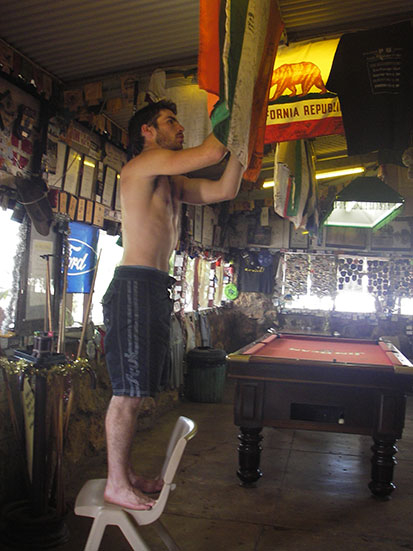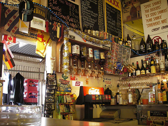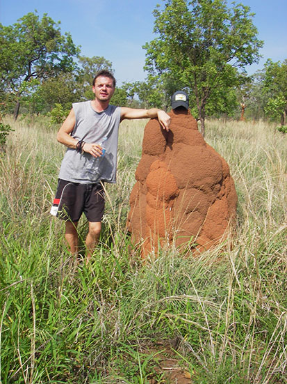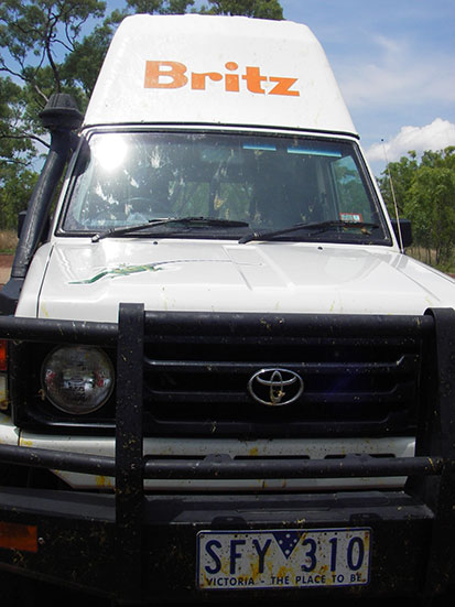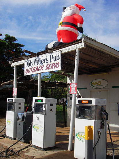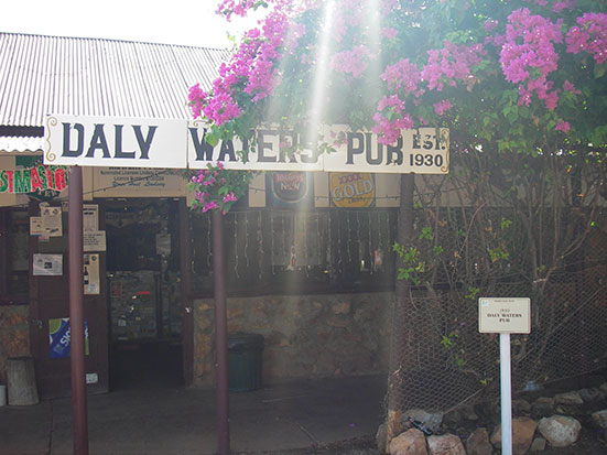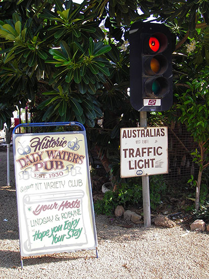 Wir fuhren erst mal gut 70km weiter und fanden den Daly Waters Pub. Ein paar Toiletten am Park hatten Wasser. Zähneputzen, Katzenwäsche und erst mal wieder ein halber Mensch. Der Pub war megacool. Überall hingen Hinterbleibsel der Reisenden, die an diesem abgelegenen Ort durchkamen. Da waren Imma-Bescheinungen von Studenten, Ausweise, BHs und sonst was. Coole Athmosphäre mit dem „most remote traffic light“ Australiens. Ich aß ein Steak-Sandwhich mit allerhand. Café geschluckt und auf einmal war wieder alles in bester Ordnung. Ich hinterließ Business Card und kritzelte was auf ’ne Iren-Fahne. Es war gut, Moral wieder bergauf. Termitenhügel steinhart und immer fetter.