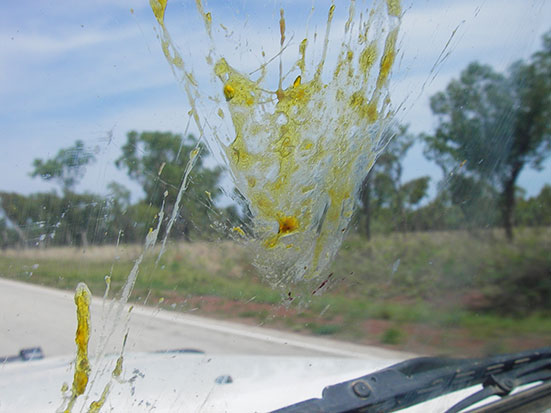 Weiter auf ’nem Stück Straße saß einer ganzer Schwarm von Grashüpfern. Die sprangen kurz vor unserer Karre hoch und explodierten mit ’ne dumpfen Knall auf der Windschutzscheibe oder am Dach. Massenmord. Das Auto jetzt mit gelbem Schleim überzogen.