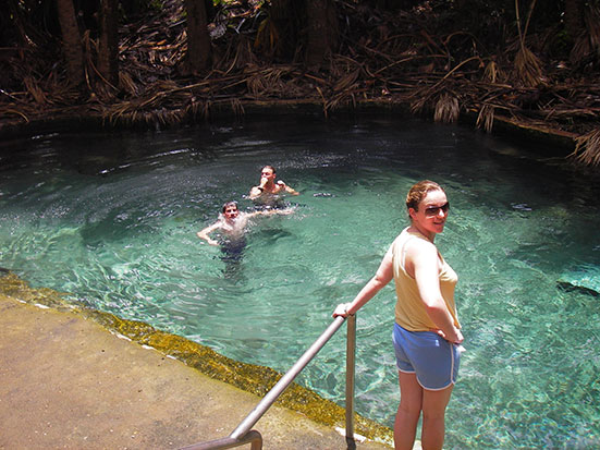 An ein paar anderen Plätzen rund um dieses Resort wurde vor Krokodilen gewarnt. Nicht ganz so nah an der Quelle waren die Tümpel auch mehr schlammig. Im klaren Wasser sahen wir auch ein Pärchen aus dem Daly Waters Pub wieder. Auf gleichen Pfaden..